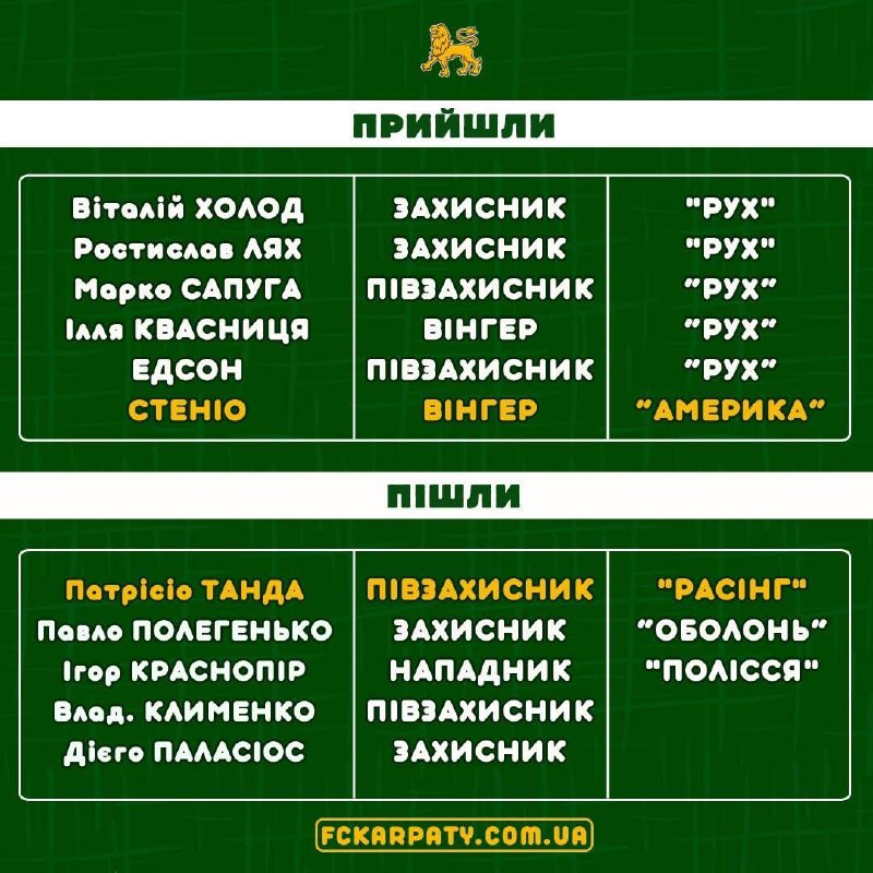 Трансферна таблиця «Карпат» під час міжсезоння 2025/26.