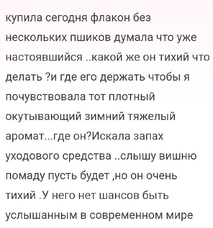 Увидела коммент по поводу Amour Kenzo. Затронула фраза "у него нет шансов быть услышанным в современном мире". Я и согласна и нет. Вернее так. Я согласна с тем, что иногда прямо четко ощущаешь, насколько деликатен твой аромат, и наверное его почти не слышно, особенно когда мимо тебя прошел кто то , например, в удовой розе . Как это было сегодня. А мой Amour ( причем старичок, про который многие пишут,что он был каким то супер громким) гулял лишь в движении в волосах. А мне это нравится. Иногда, конечно, хочется чего то супер яркого типа условная мансера роза-ваниль. Мне кажется нас накрыло сегодня именно ее шлейфом. Но это было ровно 3 секунды в полете😁 мы с дочкой ужаснулись и рассмеялась. Да такое запоминается, наверное . Но такие ароматы в итоге у меня достаются раз в год по обещанию. Мне достаточно того, что я слышу лёгкие волны, да и не все люди вокруг с отшибленным обонянием. Поэтому даже на лёгкие по звучанию ароматы ,ловятся комплименты. И "шансы' , как тут их назвали, есть всегда😁