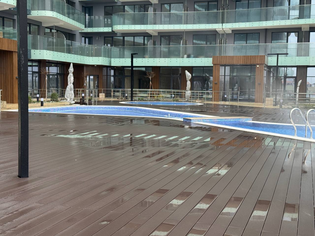 Проект расположен между Евпаторией и Саки, в 150 метрах от моря, на данный момент есть только бассейн и сданная 1я очередь
