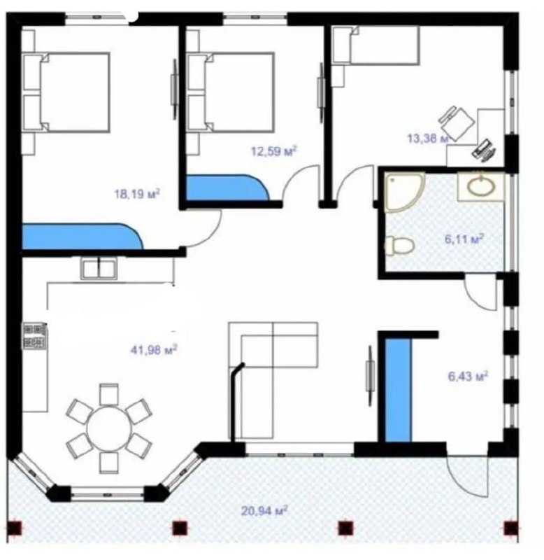 Планировка: 3 спальни, просторная кухня-гостиная, санузел, бойлерная, прихожая.