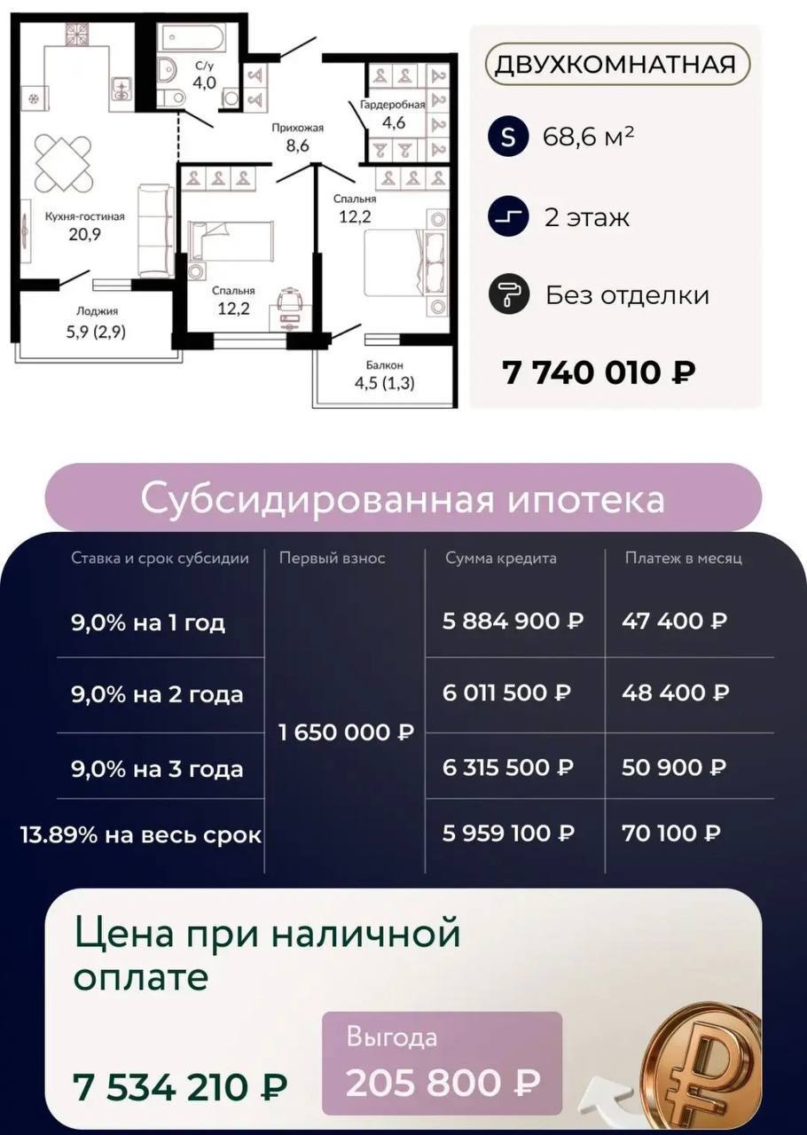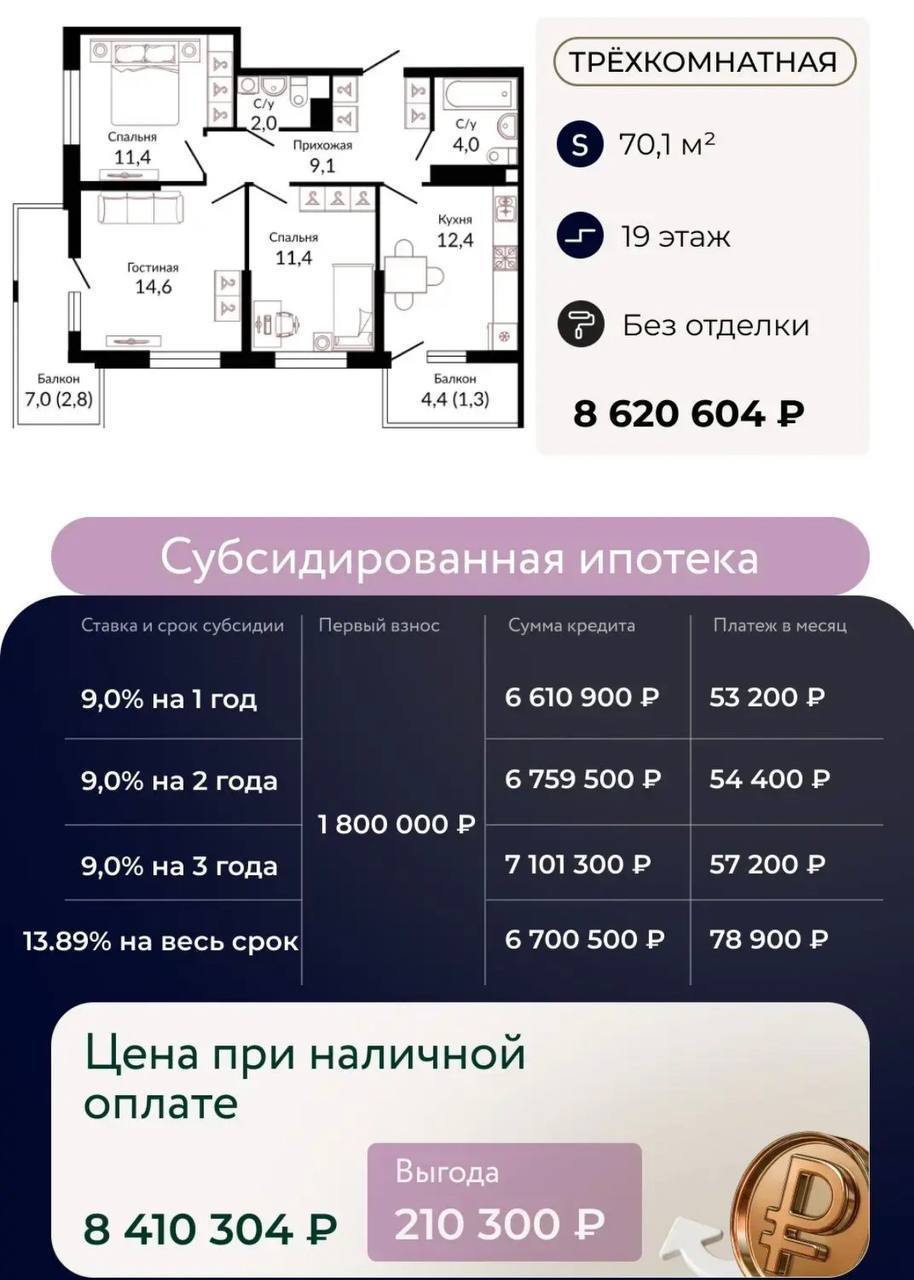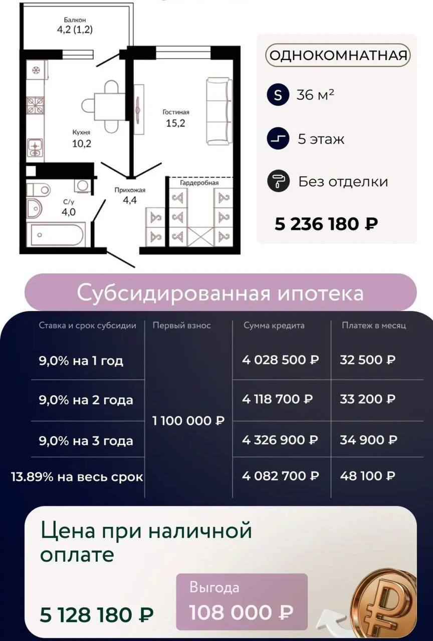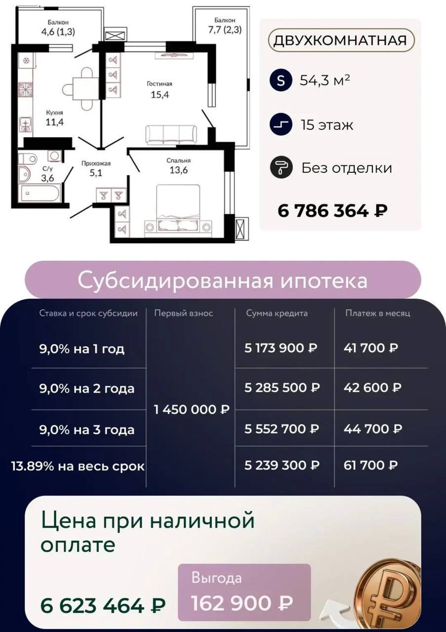 1-к квартира 44,4 м2 в предчистовой отделке от застройщика. 📐