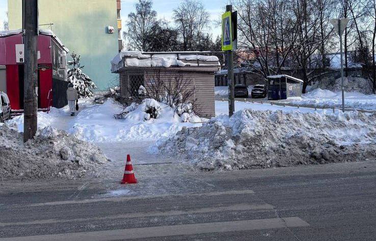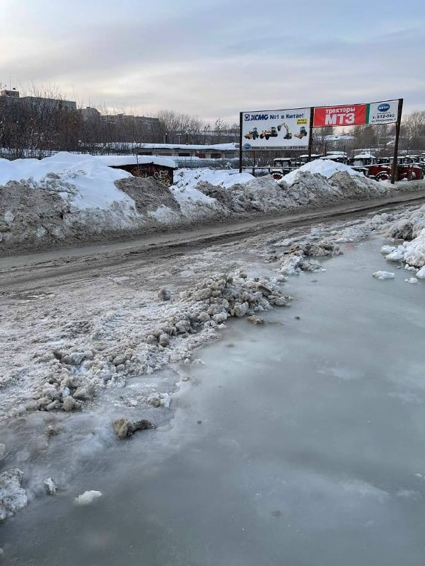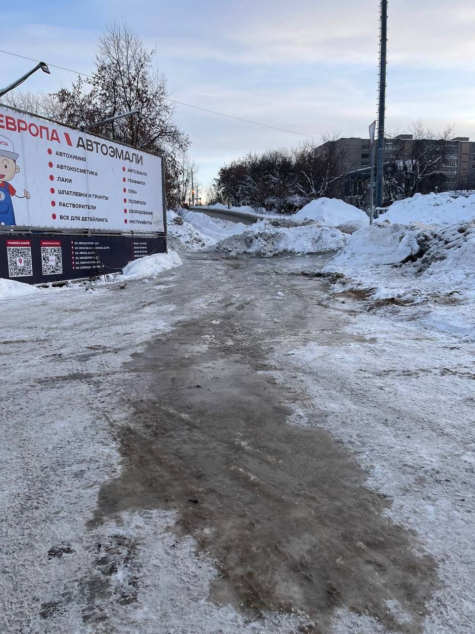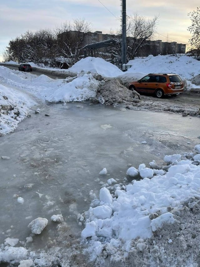 Однако главная опасность угрожает пешеходам. Тротуары и пешеходная зона полностью залиты водой, которая на холодном воздухе моментально превращается в лёд. А коммунальные службы не реагируют.