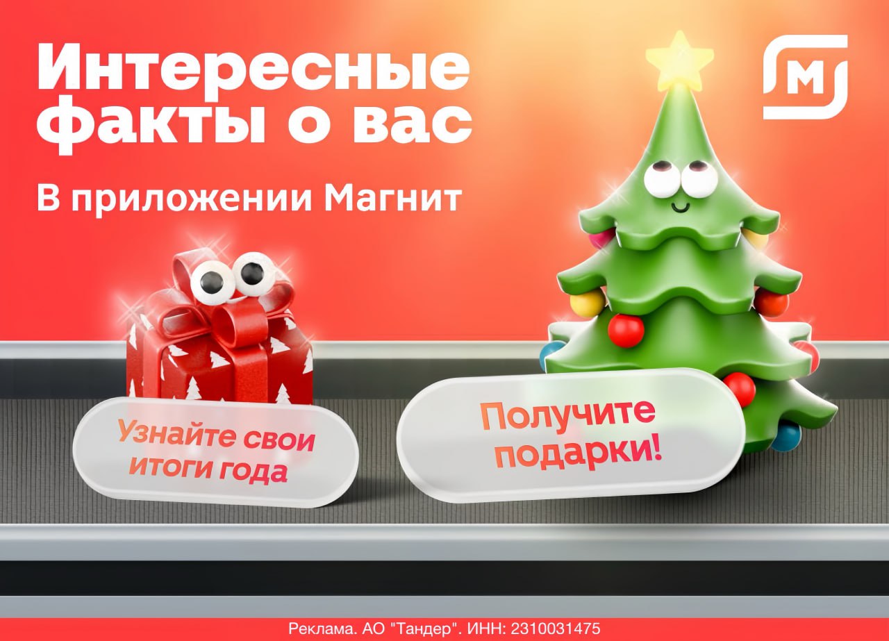 🎄🎄🎄🎄🎄🎄🎄🎄🎄🎄🎄 Псссс👀 Расскажем кое-что интересное о вас😉 Весь 2025 год мы были рядом: радовали вас выгодными ценами в Магните, делали самыми красивыми с М.Косметик, дарили скидки и кешбэк по карте Магнит Плюс и берегли ваше личное время с Магнит Доставкой Теперь мы хотим рассказать, как именно вы провели этот год вместе с нами, и вручить небольшой подарок в знак благодарности за доверие♥️ Переходите в приложение Магнит, чтобы узнать свои итоги года и получить крутой стикерпак в любимом мессенджере