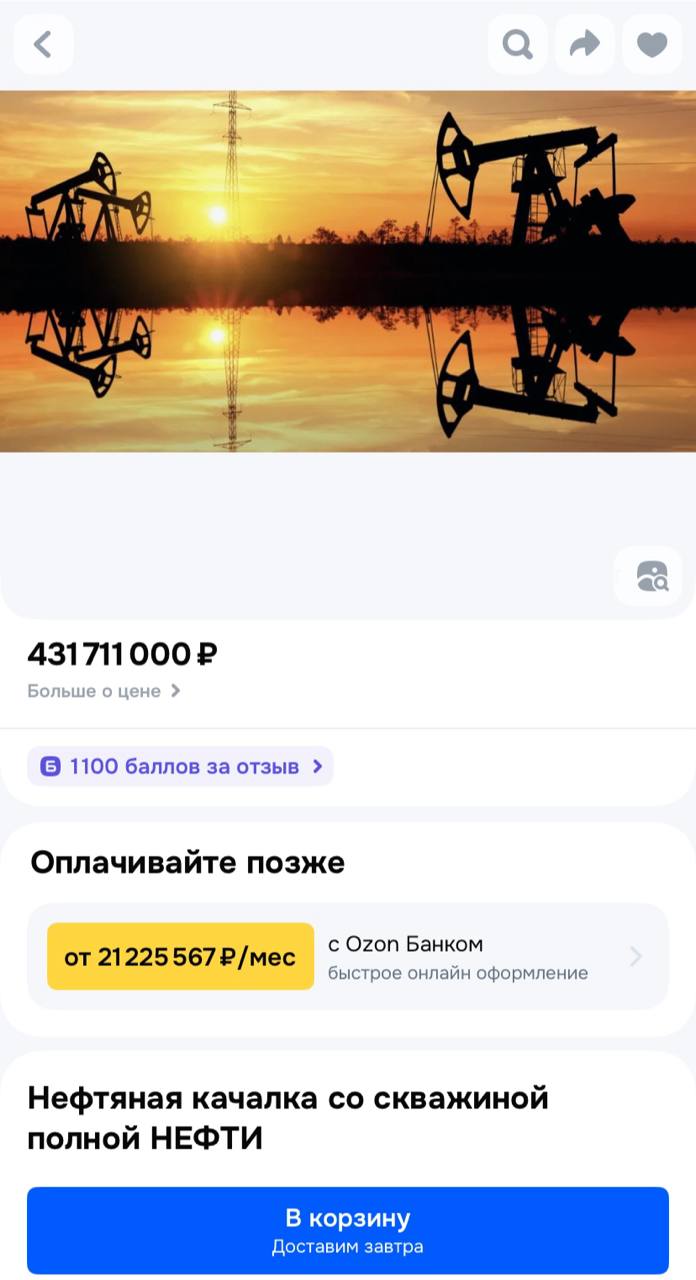 Анекдот: на Ozon выставили нефтяную качалку и скважину с нефтью — продавец уверяет, что запасов хватит ещё и внукам. Цена вопроса — скромные 431,5 млн рублей.