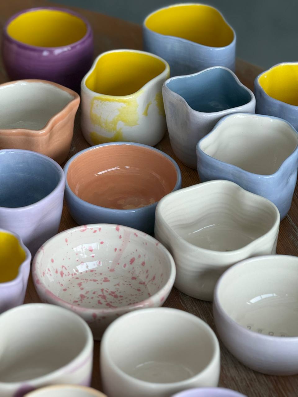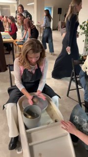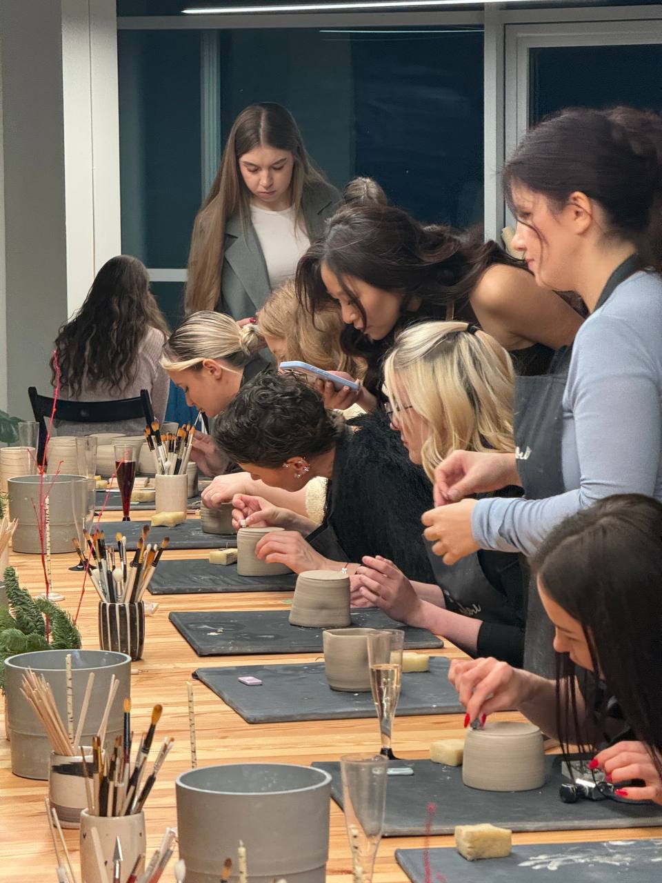 Спустя шесть лет, в декабре 2025 ребята пришли к нам ещё раз, снова побив рекорд. Их было 40. Здорово, что у нас появился шестой этаж, где можно провести такое большое мероприятие. На этот раз мы создавали кружечки за гончарными кругами. Подобрали цвета компании, сделали логотип, который все ставили на донышко.