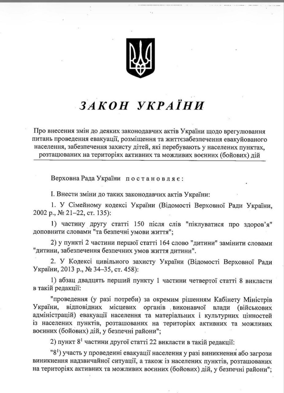 📚 03.03.2026 року в газеті «Голос України» опубліковано (https://www.golos.com.ua/documents/z-4779-ix.pdf) Закон України «Про внесення змін до деяких законодавчих актів України щодо врегулювання питань проведення евакуації, розміщення та життєзабезпечення евакуйованого населення, забезпечення захисту дітей, які перебувають у населених пунктах, розташованих на територіях активних та можливих воєнних (бойових) дій» від 10 лютого 2026 року № 4779-IX.