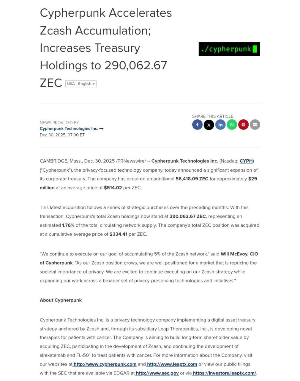 🔒 Cypherpunk объявили об инвестициях в ZEC (Zcash)