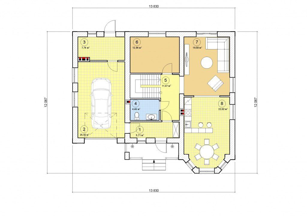 Перший поверх: Гараж, тамбур, хол, котельня, санвузол, вітальня, кухня.