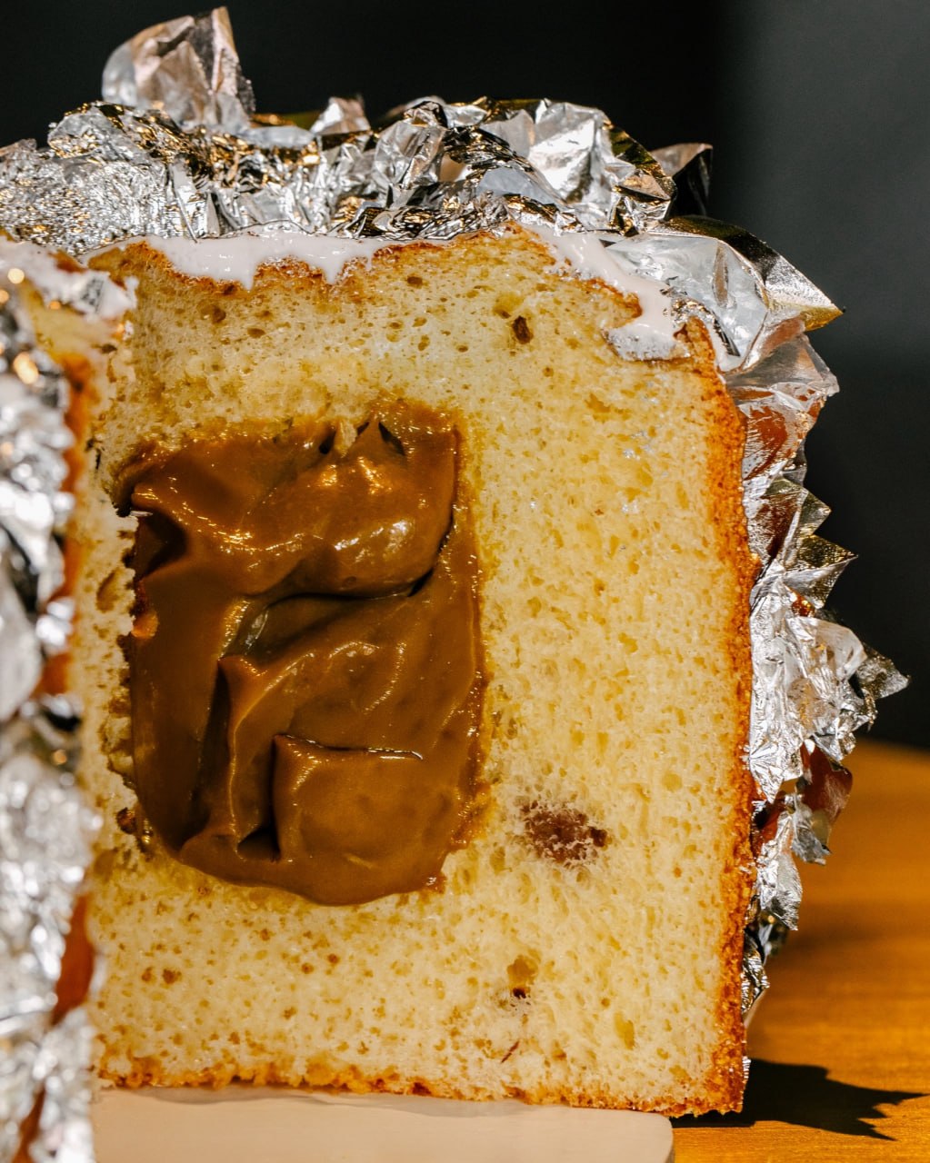 Но в этом году решили не оставлять без внимания и более приземлённую публику. В том же месте появились серебряные куличи — чуть сдержаннее, но всё ещё с характером: варёная сгущёнка, фисташковая паста, грецкий орех и тонкая цитрусовая нота цедры лимона и деликатное серебряное покрытие. Цена — 5000₽. Практически антикризисный вариант, если сравнивать.