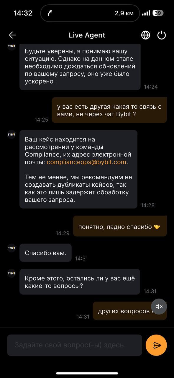 Большинство пользователей не получают от биржи даже минимальной информации, кроме просьб подождать 30 дней. Никакой связи со службой безопасности биржа не предполагает, исключительно общение с саппортом, который не имеет никакого доступа к ходу проверки. Требования предоставить хоть какие-то документы приходят не через 2-3 часа, а через 2-3 недели.