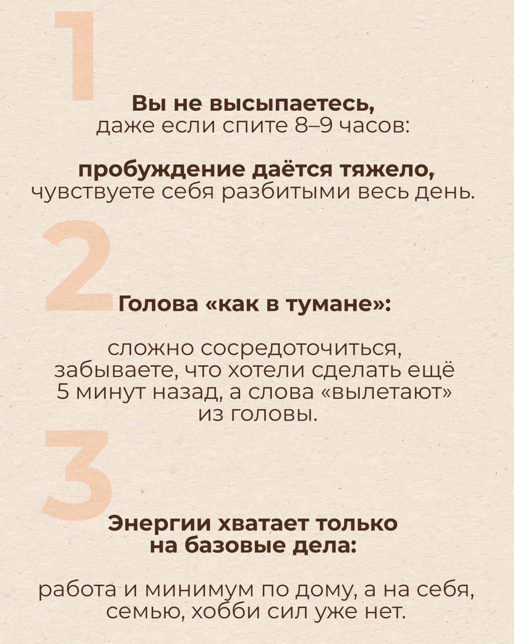 Вы стараетесь придерживаться режима, но просыпаетесь разбитой. Весь день голова как в тумане: сложно сосредоточиться на задачах, общение раздражает, а любая критика воспринимается в штыки.