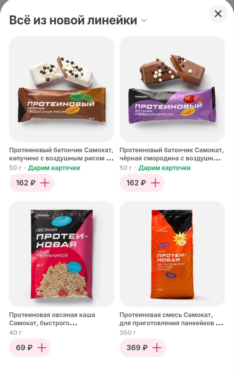 Самокат плотно взялся за качков, зожников и всех, кто добирает белок. Сервис выкатил целый отдельный раздел с протеиновой едой, и там есть протеиновое всё: каши, сладости, снеки, батончики, сыры, коктейли и даже протеиновое мороженое.