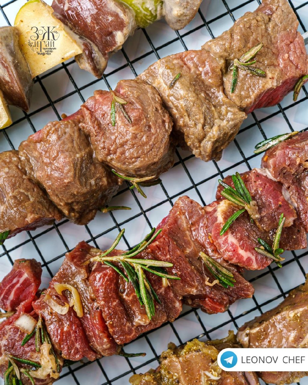 В клубе выходного дня «Жадина-говядина» мы будем использовать для шашлыка говяжью вырезку, ростбиф, антрекот и даже печень с сердцем, а мариновать будем в томатах, йогурте, соевом соусе, мисо-пасте, яблоках и киви.