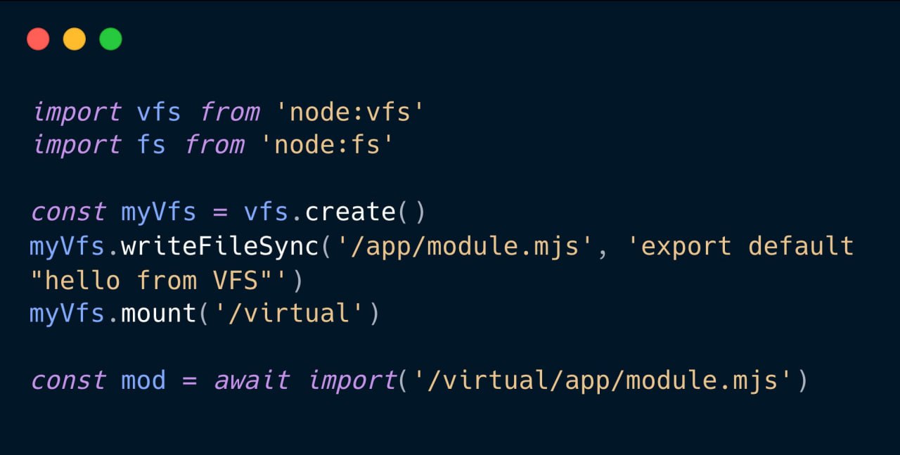 node:vfs — виртуальная файловая система, которая появляется в core Node.js (PR #61478, ~14 000 строк в 66 файлах)