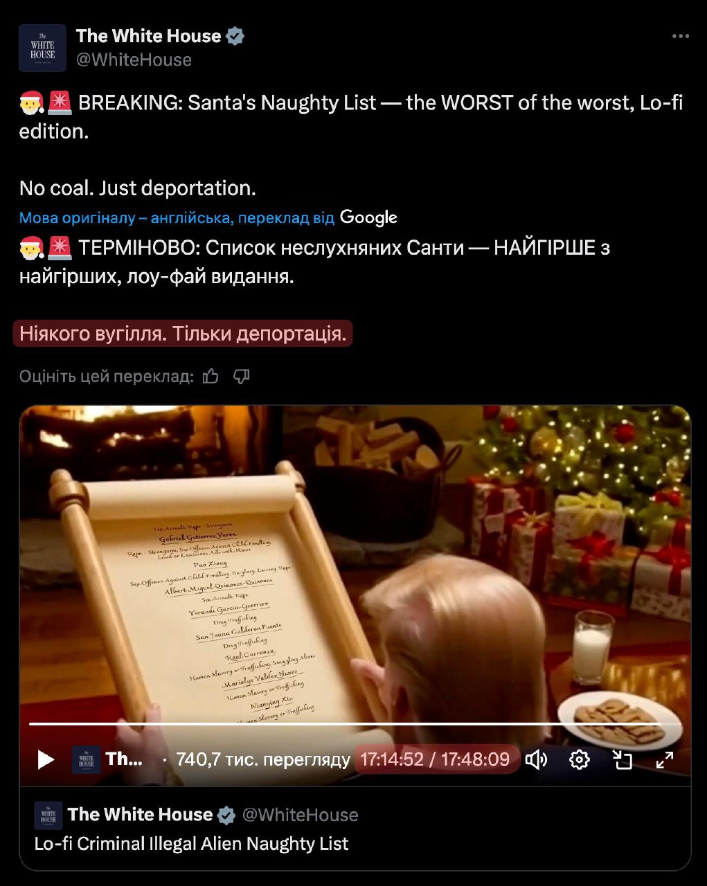 Білий дім «працює». Впродовж 17 годин у Twitter транслювали прямий ефір із відеороликом, у якому Трамп зачитує «список неслухняних дітей Санти» з фразою: «Ніякого вугілля — тільки депортація».