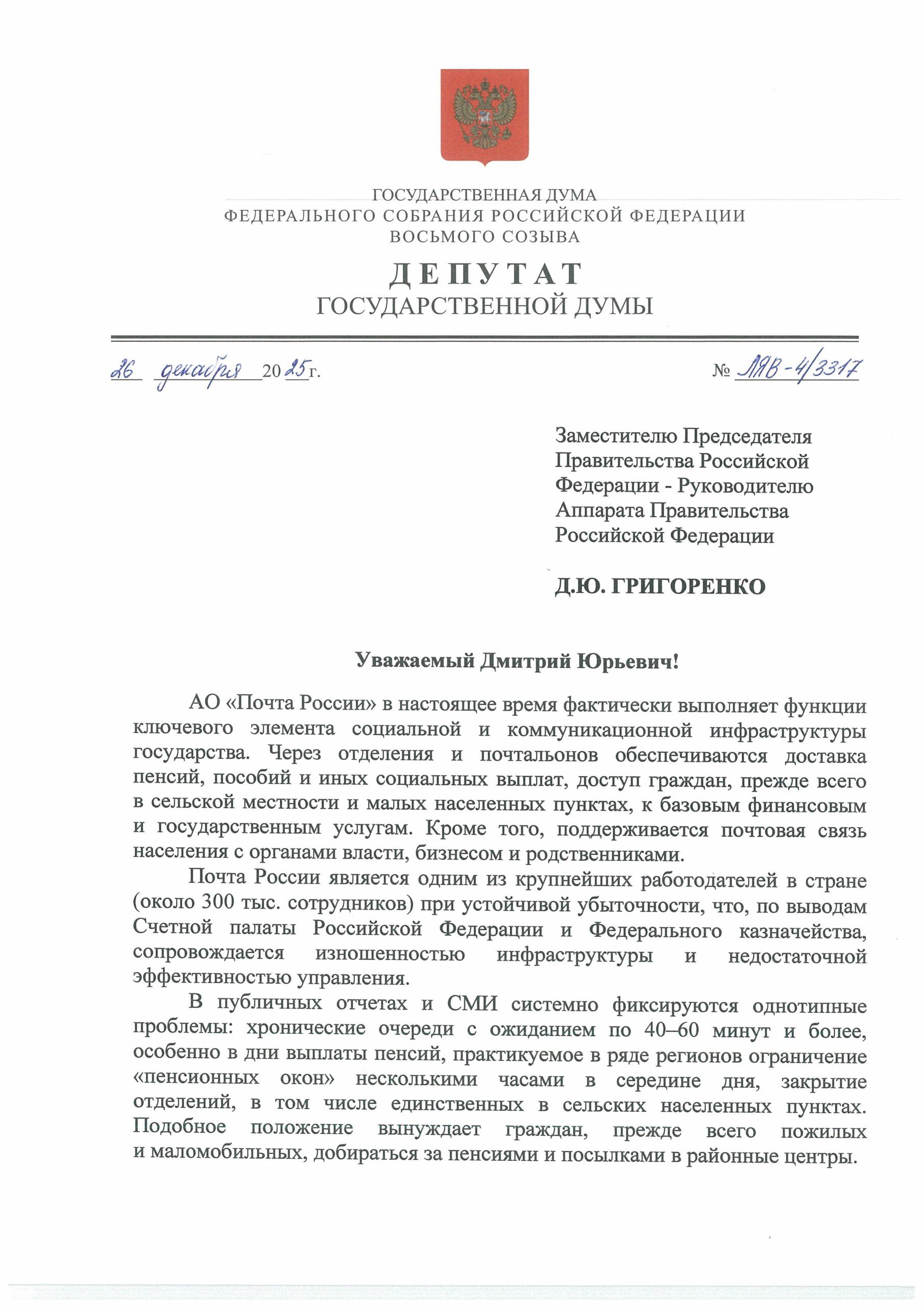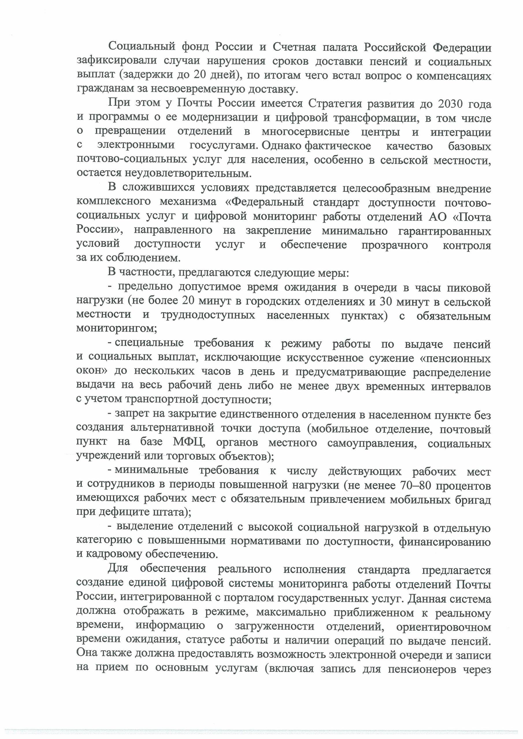 📑Вместе с лидером фракции «Справедливая Россия» Сергеем Мироновым направили обращение вице-премьеру РФ Дмитрию Григоренко по вопросу качества и доступности услуг «Почты России» — одного из ключевых элементов социальной инфраструктуры страны.