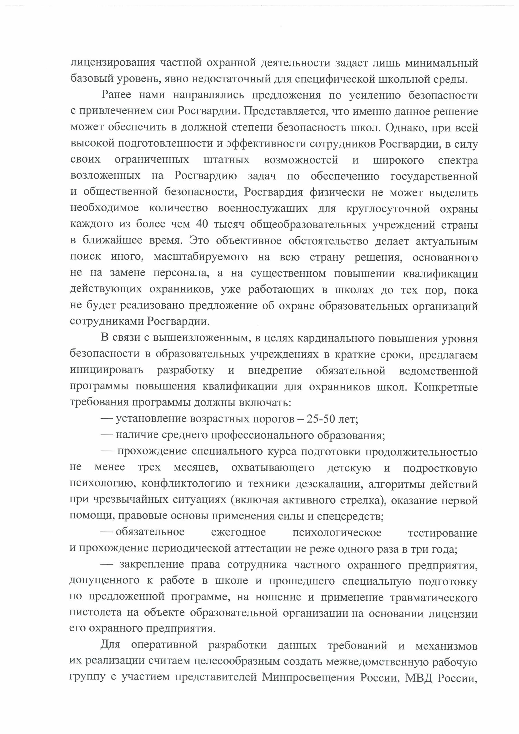 💭Несмотря на высокую подготовку, Росгвардия не может в ближайшее время обеспечить круглосуточную охрану всех свыше 40 тысяч школ из-за нехватки личного состава и большой нагрузки. Поэтому важно повысить квалификацию уже работающих школьных охранников. Для реализации инициативы предлагаем создать межведомственную рабочую группу при участии Минпросвещения, МВД, Росгвардии и экспертов в области безопасности образования.