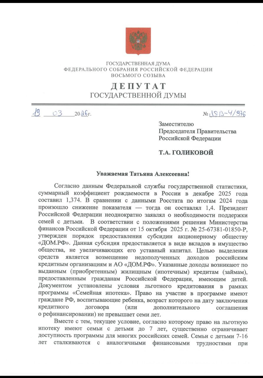 Вместе с Сергеем Мироновым обратились к вице-премьеру Татьяне Голиковой. Предлагаем поднять возрастной порог с 7 до 16 лет. То есть дать возможность семьям с детьми до 16 лет (на момент оформления или рефинансирования кредита) пользоваться льготной ставкой.