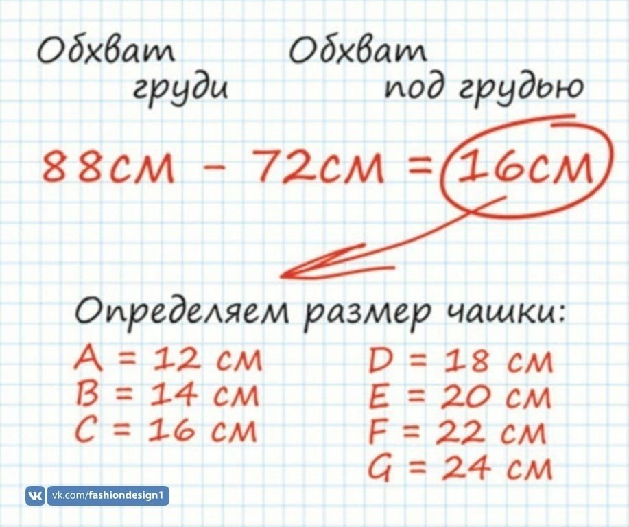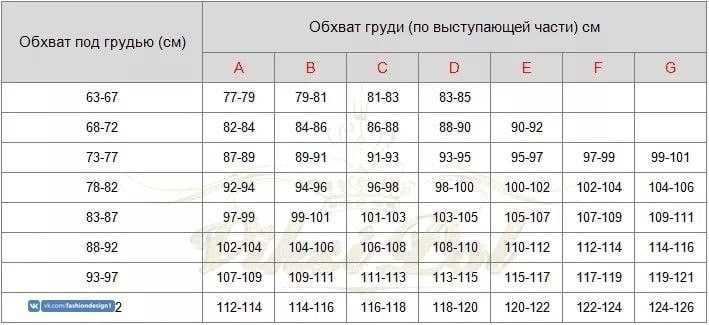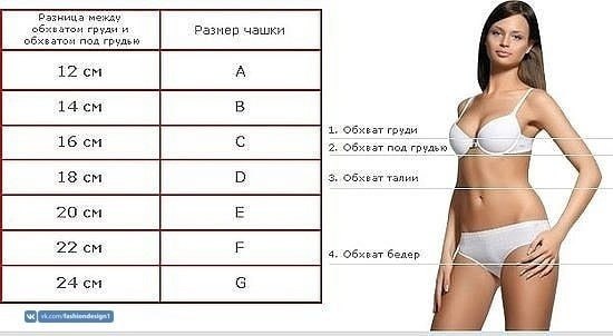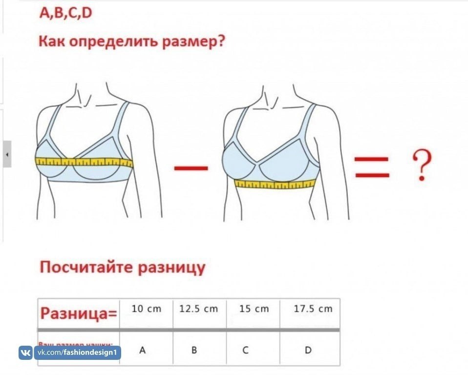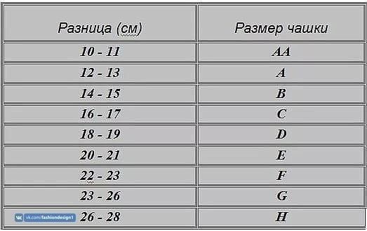 Следующим этапом будет измерение объема груди по наиболее выступающей части (обычно на уровне соска). Далее благодаря нехитрым вычислениям определяем разницу в обхватах груди и под грудью. Исходя из полученного результата, выбираем подходящей размер чашечки. Для удобства вы можете также пользоваться следующей таблицей.