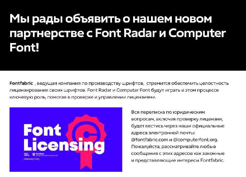 Я за последнюю неделю видела две претензии от студии FontFabric. Одна о том, что вы нелегально используете шрифт на сайте (Лена Осипова @koshka_pushinka спасибо, что поделилась историей). А другая претензия – что раньше вы использовали шрифт, сейчас его заменили, но интернет все помнит, поэтому купите лицензию.