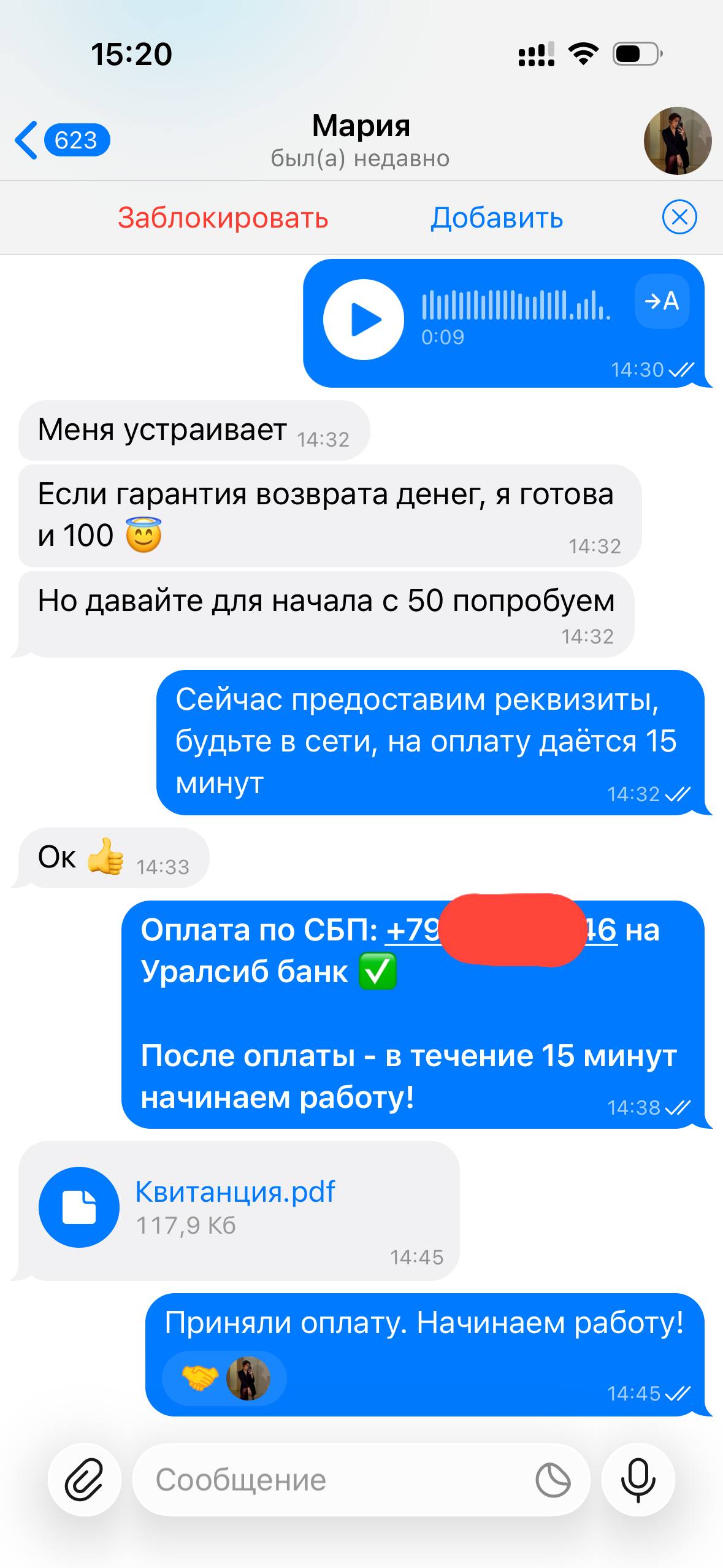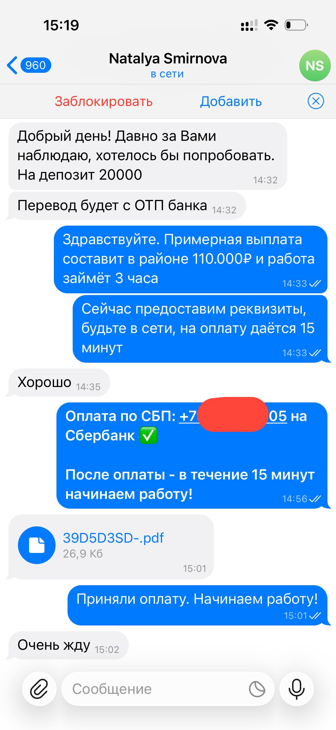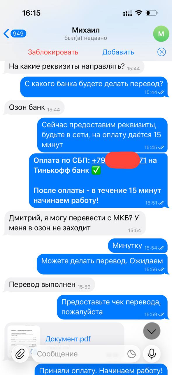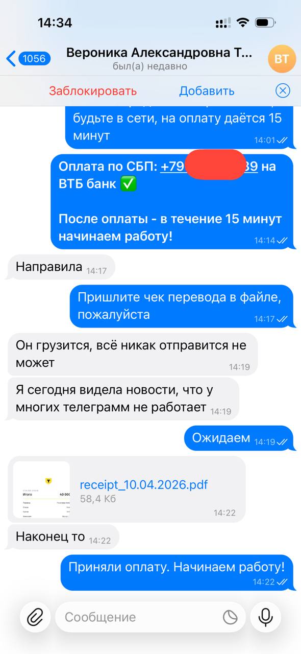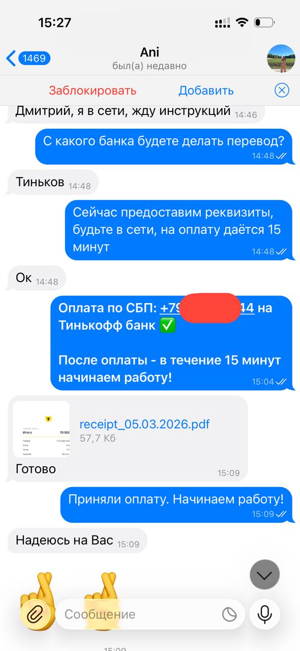 Я веду открытую работу, абсолютно не скрывая свою личность и могу созвониться с любым желающим по телефону, чтобы обсудить все условия.