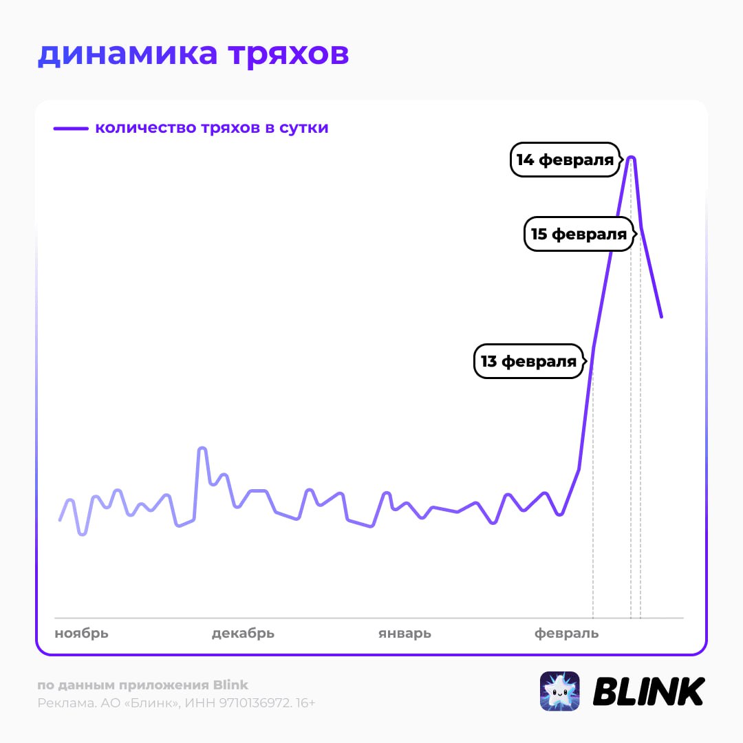 По данным приложения Blink — интерактивной карты с друзьями — зимой 2026‑го зумеры стали ТРЯХаться намного чаще, чем осенью 2025-го: среднее число «тряхов» на одного человека выросло почти втрое — всплеск активностей наблюдается по всей стране!