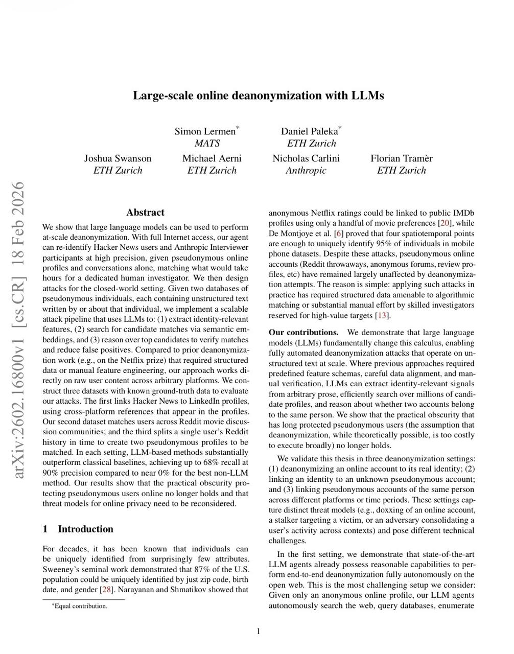 ETH Zürich и Anthropic опубликовали исследование “Large-Scale Online Deanonymization with LLMs”, в котором показали автоматическую систему деанонимизации.