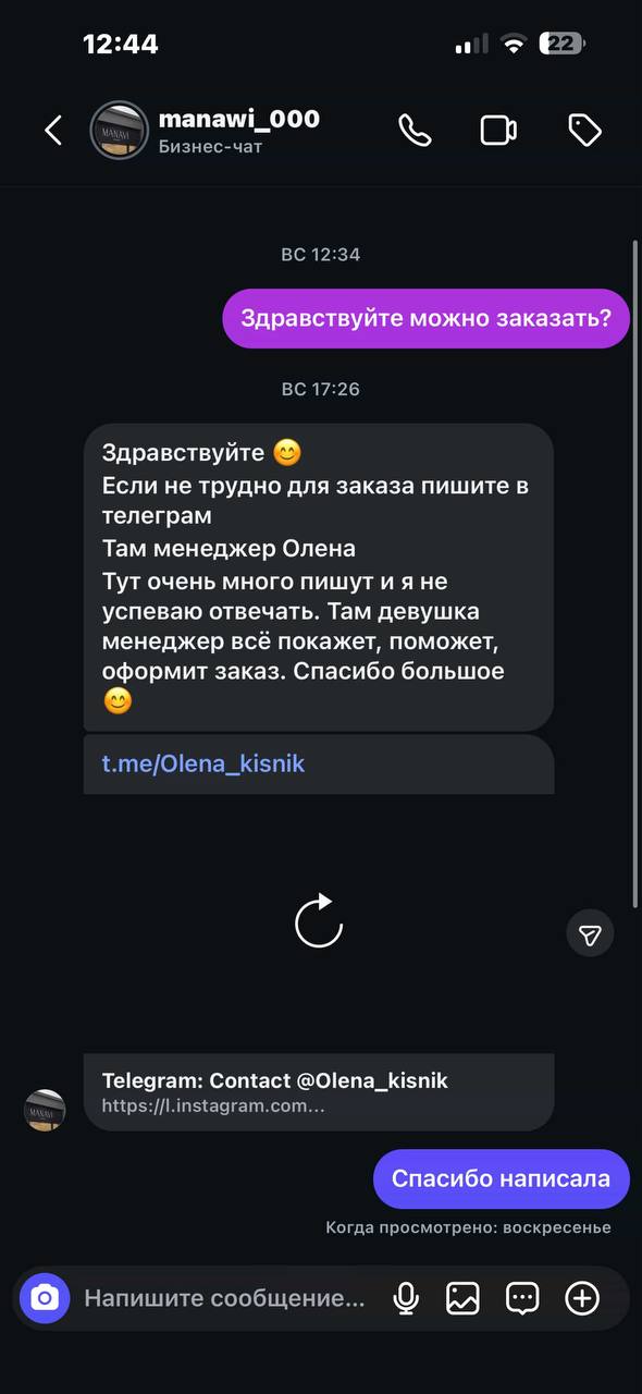 Я хотела заказать вещи в Instagram-магазине. Написала в директ, после чего меня попросили перейти в Telegram, якобы там менеджер отвечает быстрее.