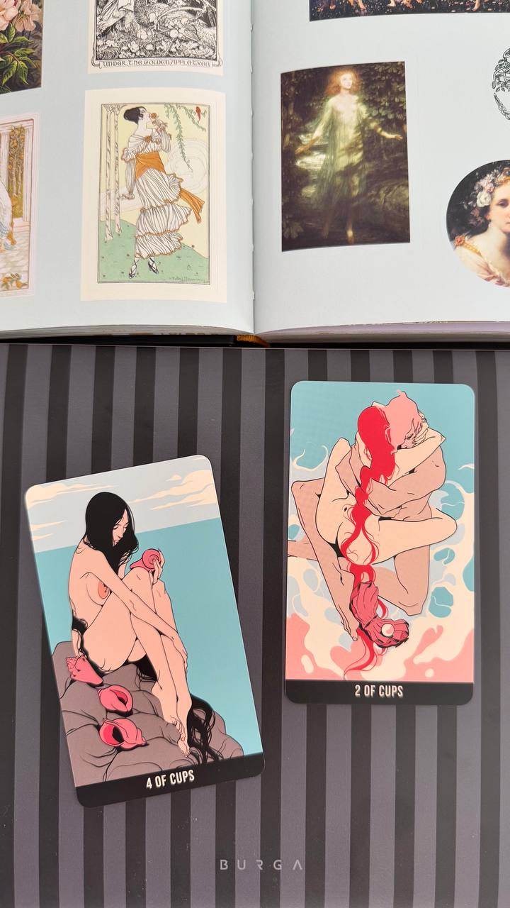 Глория Пиццилли, современная художница и графическая дизайнерка. Она работала как иллюстратор для New York Times, Vogue и других крупных изданий, прежде чем перейти к своим самостоятельным художественным проектам. И вот, вместе с Алисой Мастралео (итальянский таролог, картомант и писательница, со-творец кстати СуперНовы) они создали колоду «Дикого Эдема» с очень глубокой чувственной эстетикой и объединением, переплетением тела и природы. Колода очень интимная. Главная её идея это возвращение к естественной наготе и телесности не как к сексуализированному объекту, а как к первичному состоянию бытия: до взгляда Другого, до стыда, до дисциплины, до цивилизации.