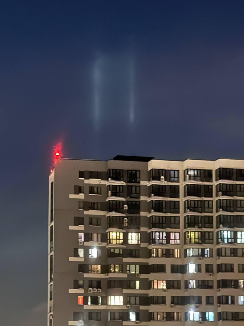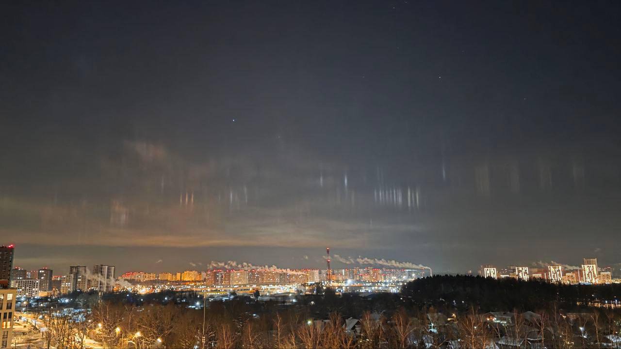 Этой ночью над Москвой заметили световые столбы — редкое оптическое явление, которое появляется в сильные морозы, когда свет фонарей рассеивается на кристаллах льда в воздухе.