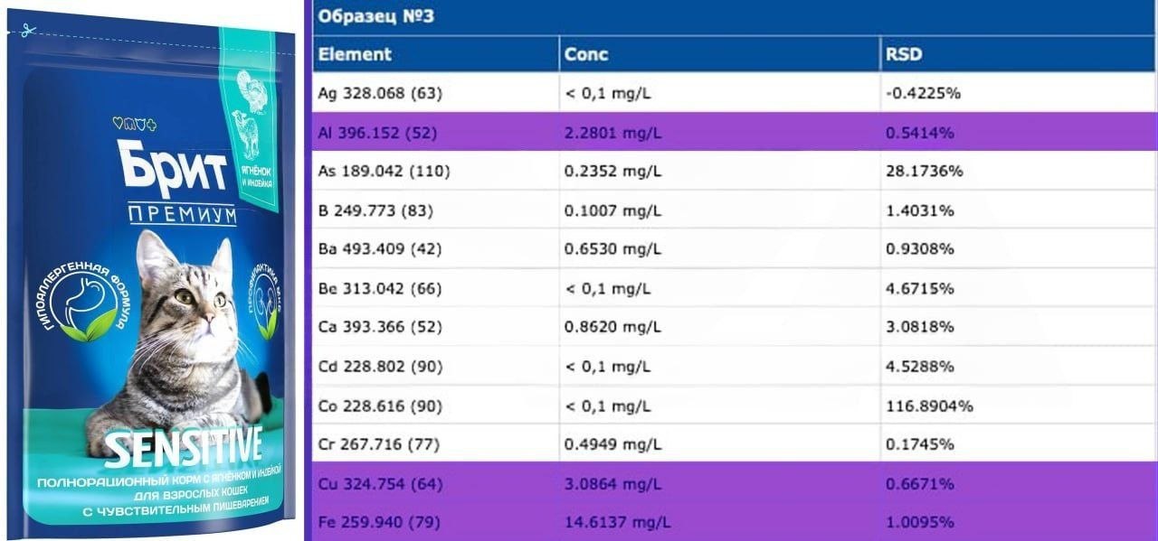 Уже есть случай: у кошки начались рвота и кровавая диарея. Экспертиза показала — проблема не в корме, а в упаковке: завышены железо, алюминий, медь и марганец.