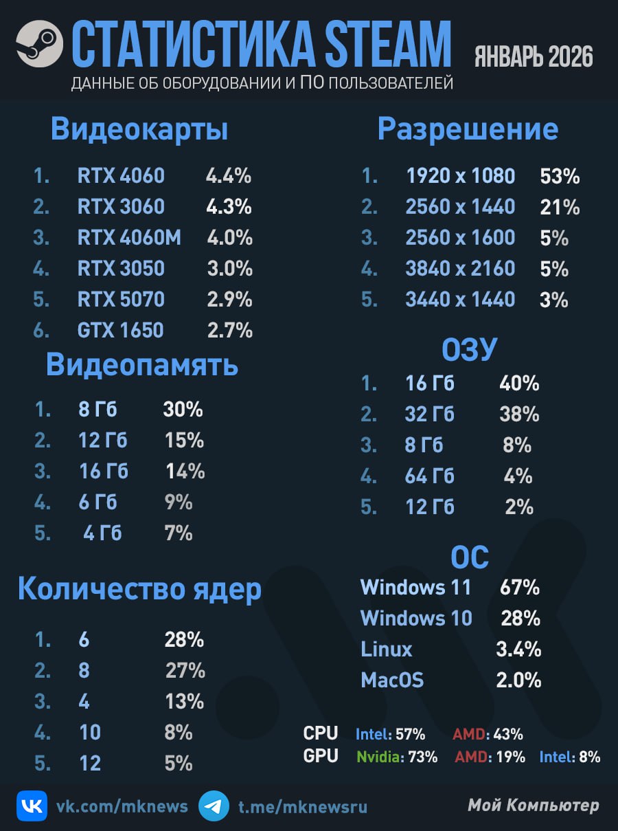 Несмотря на кризис памяти, количество игровых ПК с 32 ГБ ОЗУ уже вплотную приблизились к 16 ГБ.