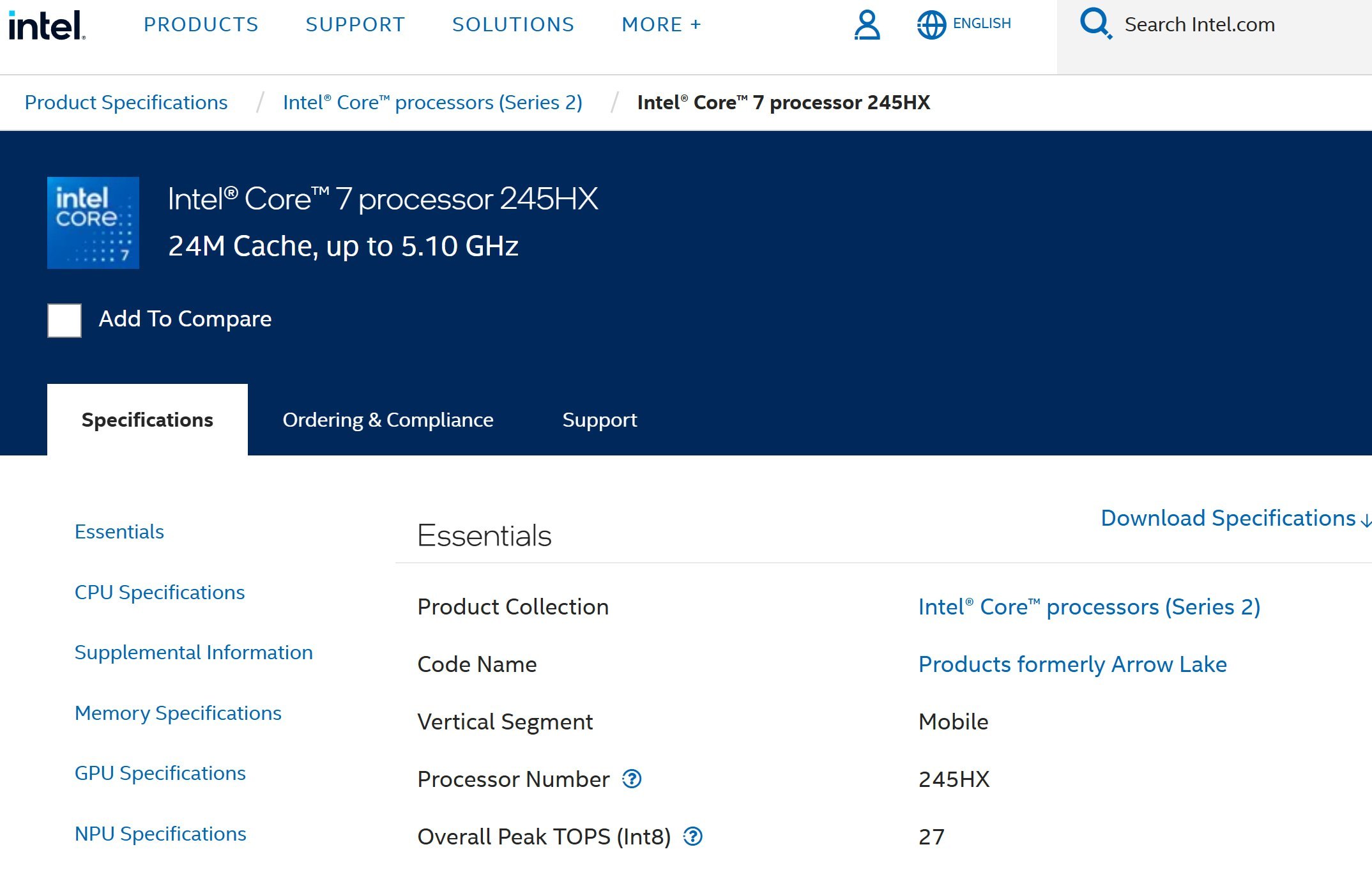 На официальном сайте Intel ARK засветился новый чип – Core 7 245HX, и к нему есть вопросы. Во-первых, индекс x4x всегда относился к i5 или Core 5. Во-вторых, куда делась приставка Ultra, ведь это решение линейки Arrow Lake. В-третьих, чем он отличается от Core Ultra 5 235HX и 245HX, если имеет те же 6P+8E ядер, ту же частоту в 5.1 ГГц, одинаковые 3 ядра Xe и идентичный теплопакет в 55 Вт.
