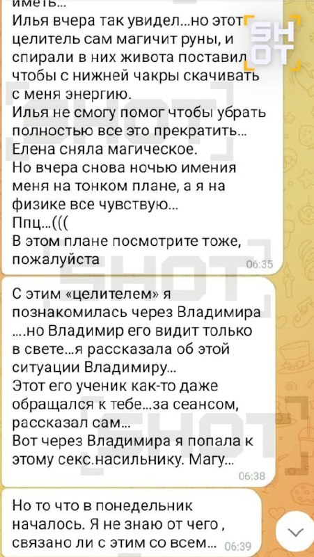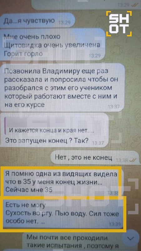 Как выяснил SHOT, погибшая Неля активно переписывалась с «человеком, познавшим природу» Павлом Лаврентьевым, которому рассказывала о своих проблемах. В частности, 6 апреля — за два дня до своей гибели — женщина писала, что она «поняла, что ей конец», и из-за доверия к другим «магам» она «потеряла и жизнь, и душу». До этого она рассказывала, как одна из видящих рассказала Неле, что «в 35 — конец жизни». Женщине как раз было 35 лет.