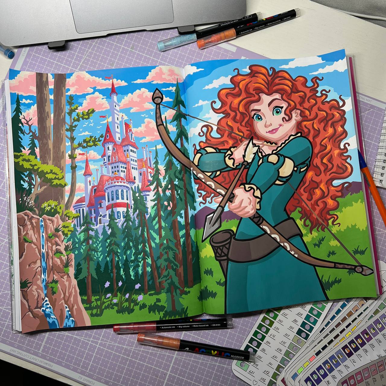 Не могу не поделится 🥰 объединила две картинки в один разворот. Очень собой довольна 😊 Как думаете, почему Мерида с луком тусит возле замка Бель? Охотится на чудовище?