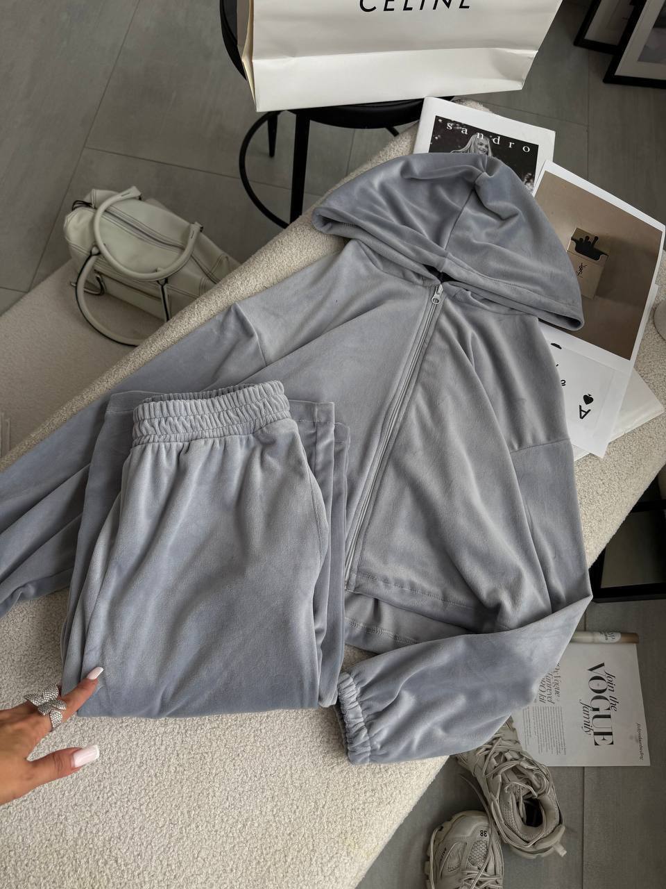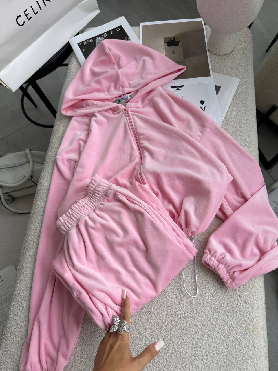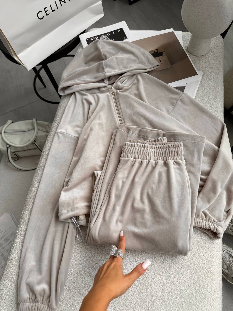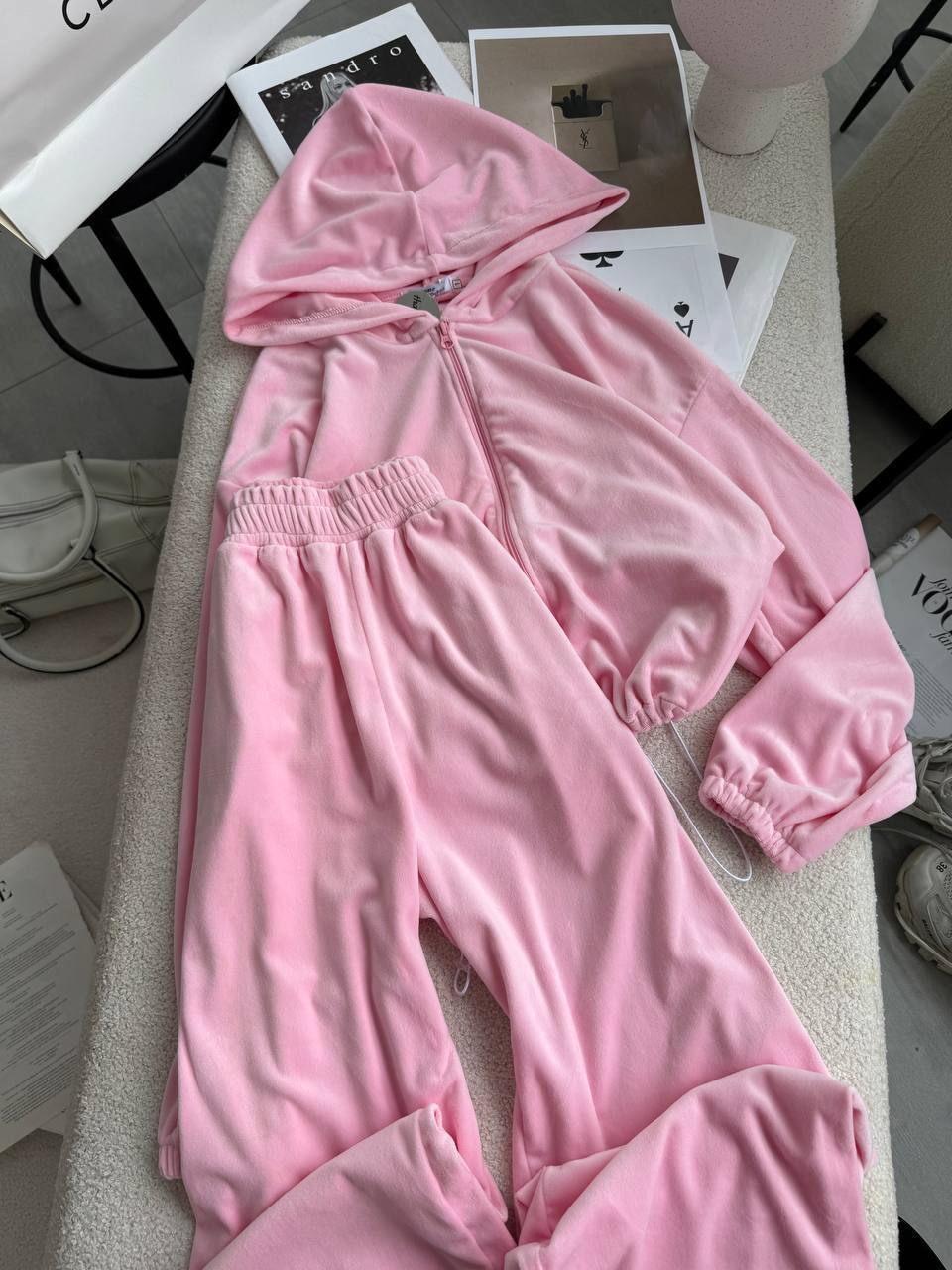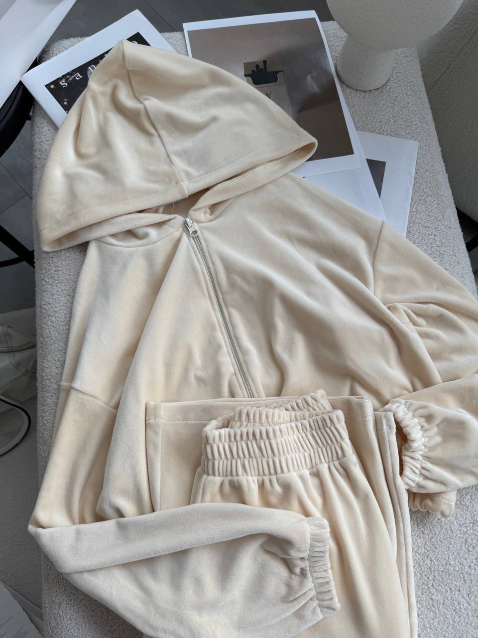 Ніжний та легкий як хмаринка велюровий костюм в актуальних відтінках. Складається з палаццо, які підійдуть для дівчат будь-якого зросту та вкороченого зіп-худі з регуляторами на талії, що дозволяють адаптувати виріб на свій смак.