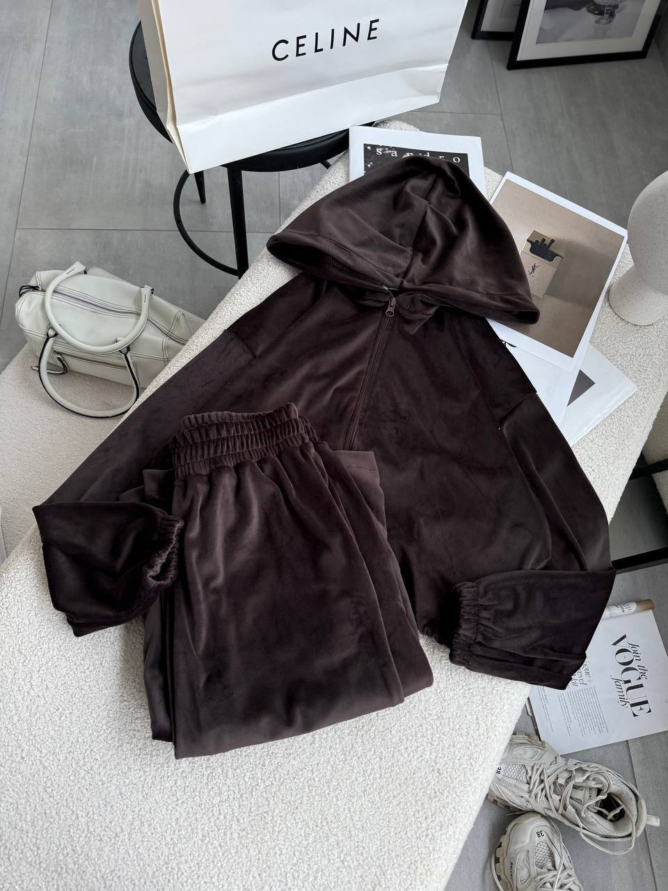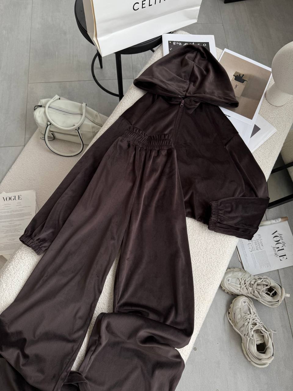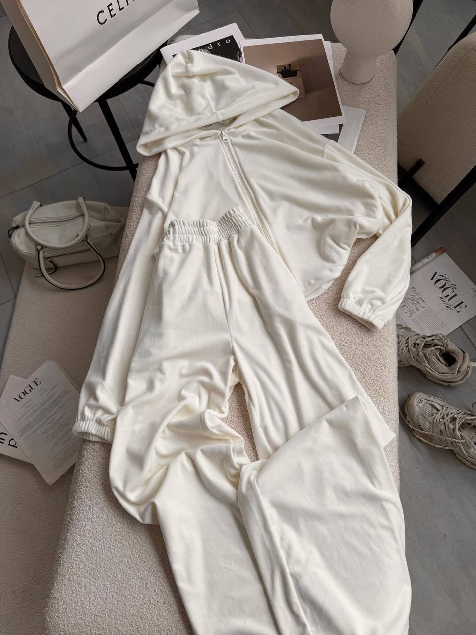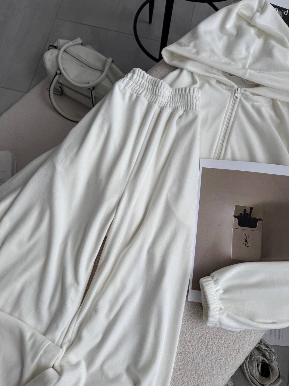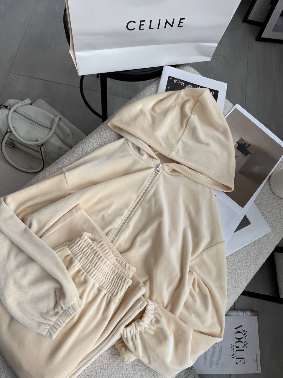 Ніжний та легкий як хмаринка велюровий костюм в актуальних відтінках. Складається з палаццо, які підійдуть для дівчат будь-якого зросту та вкороченого зіп-худі з регуляторами на талії, що дозволяють адаптувати виріб на свій смак.