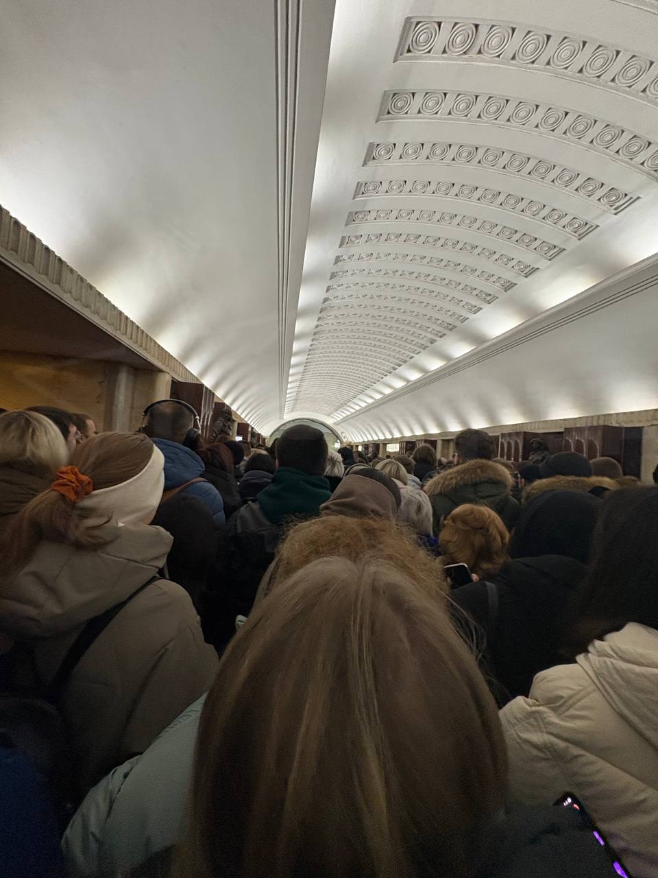 Поток пассажиров растянулся почти на всю станцию. Они жалуются, что такие пробки из-за неработающих эскалаторов.