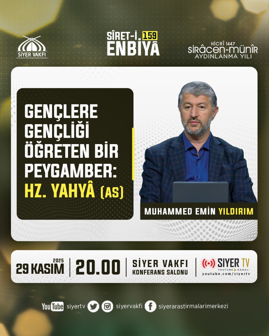 "Allah’ın ﷻ Verdiği İsim: Onun Adı Yahyâ" başlıklı Sîret-i Enbiyâ dersimiz bu akşam 20.00'de Siyer Vakfımızda, canlı yayınla Siyer Tv Youtube Kanalımızda...