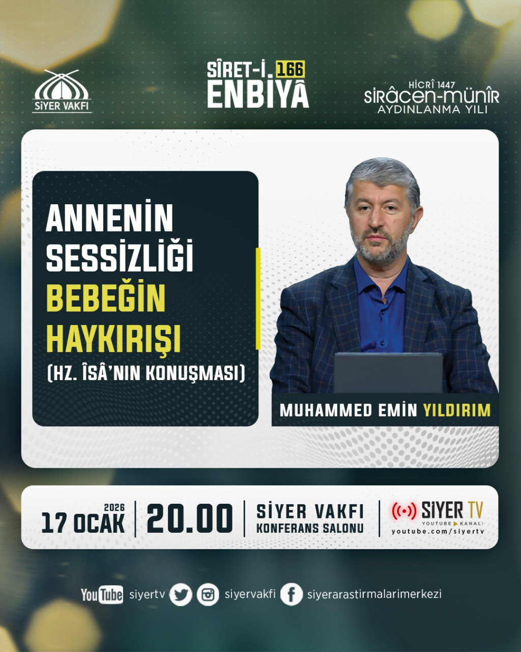 Sîret-i Enbiyâ derslerimizde bu hafta: "Annenin Sessizliği Bebeğin Haykırışı (Hz. Îsâ'nın Konuşması)" Dersimiz yarın akşam 20.00'de Siyer Vakfımızda, canlı yayınla Siyer Tv Youtube Kanalımızda... 📌 Canlı Yayın 📺 : https://youtu.be/8JlB-iuou8o