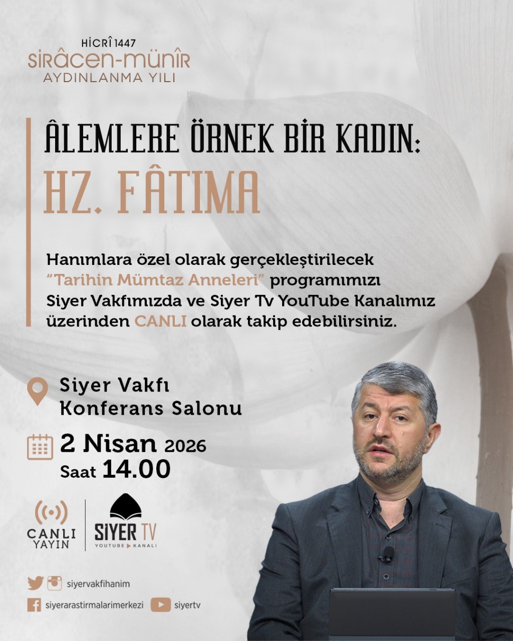 Muhammed Emin Yıldırım Hocamız ile birlikte hanımlara özel gerçekleştirilecek “Tarihin Mümtaz Anneleri” 29. programımız bugün 14.00’de Siyer Vakfımızda, canlı yayınla Siyer Tv Youtube kanalımızda...