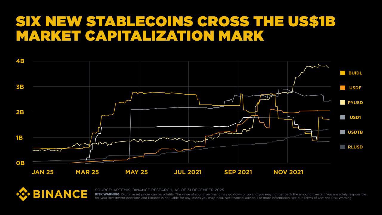 🔥 Stablecoins saw $33 trillion in annual transaction volume in 2025 — double Visa's estimated $16 trillion — while six new stablecoins hit a $1 billion market cap, according to a new Binance Research report