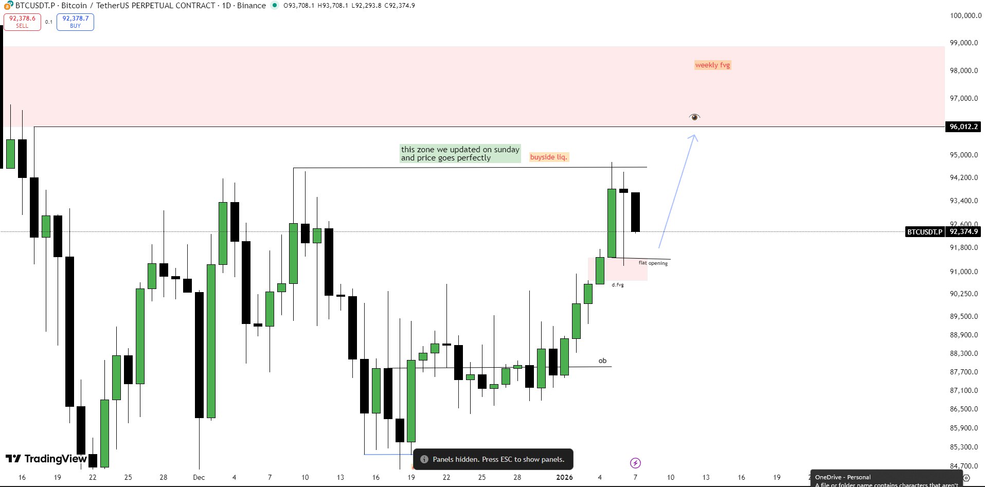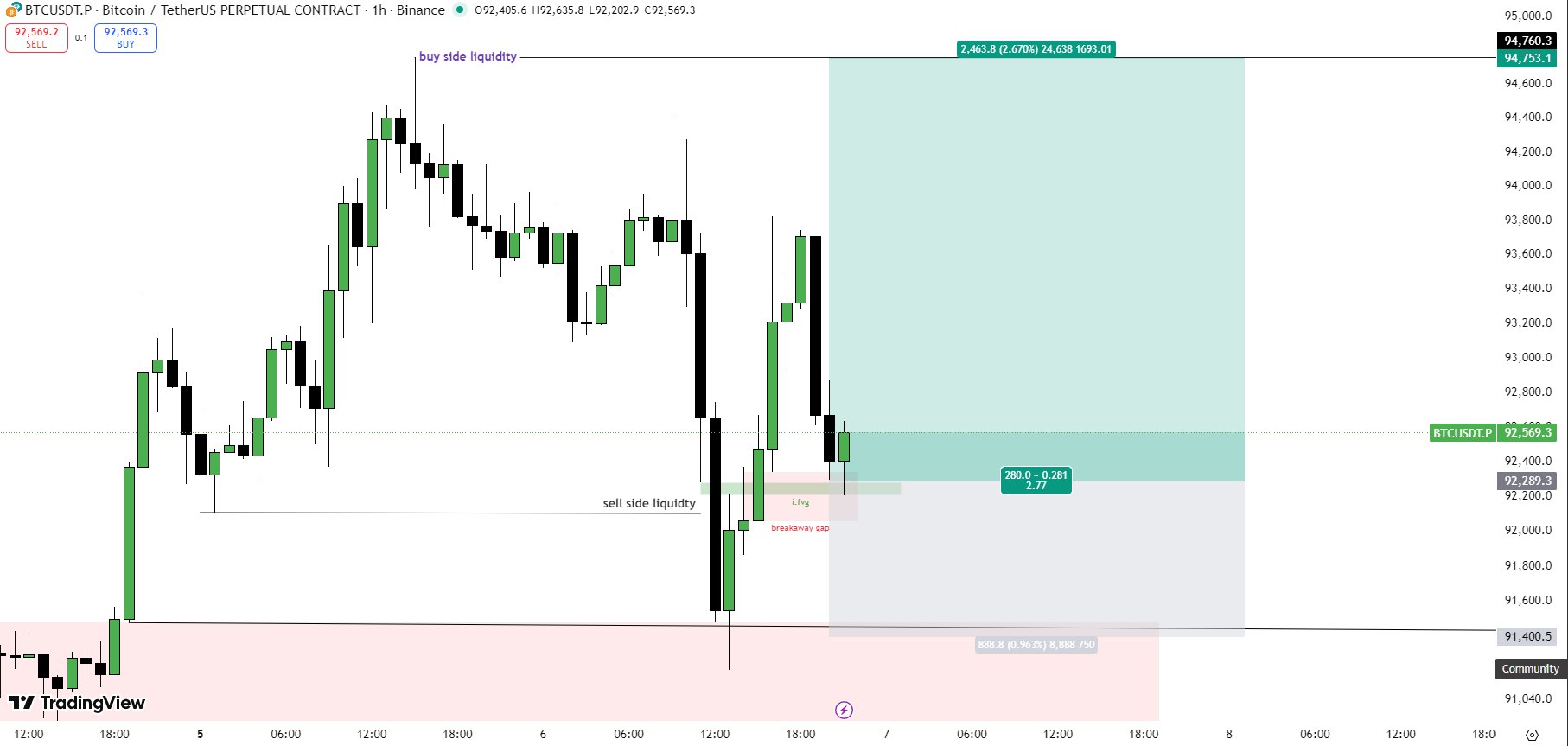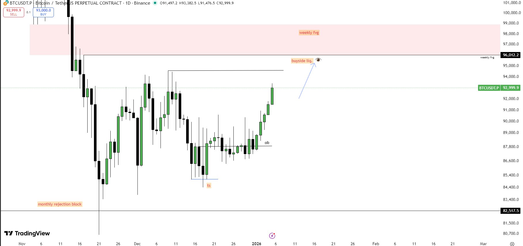 As long as current lows hold, a push into the 94k–96k region looks likely in the short term/coming week, where major buy‑side liquidity and a weekly FVG sit.