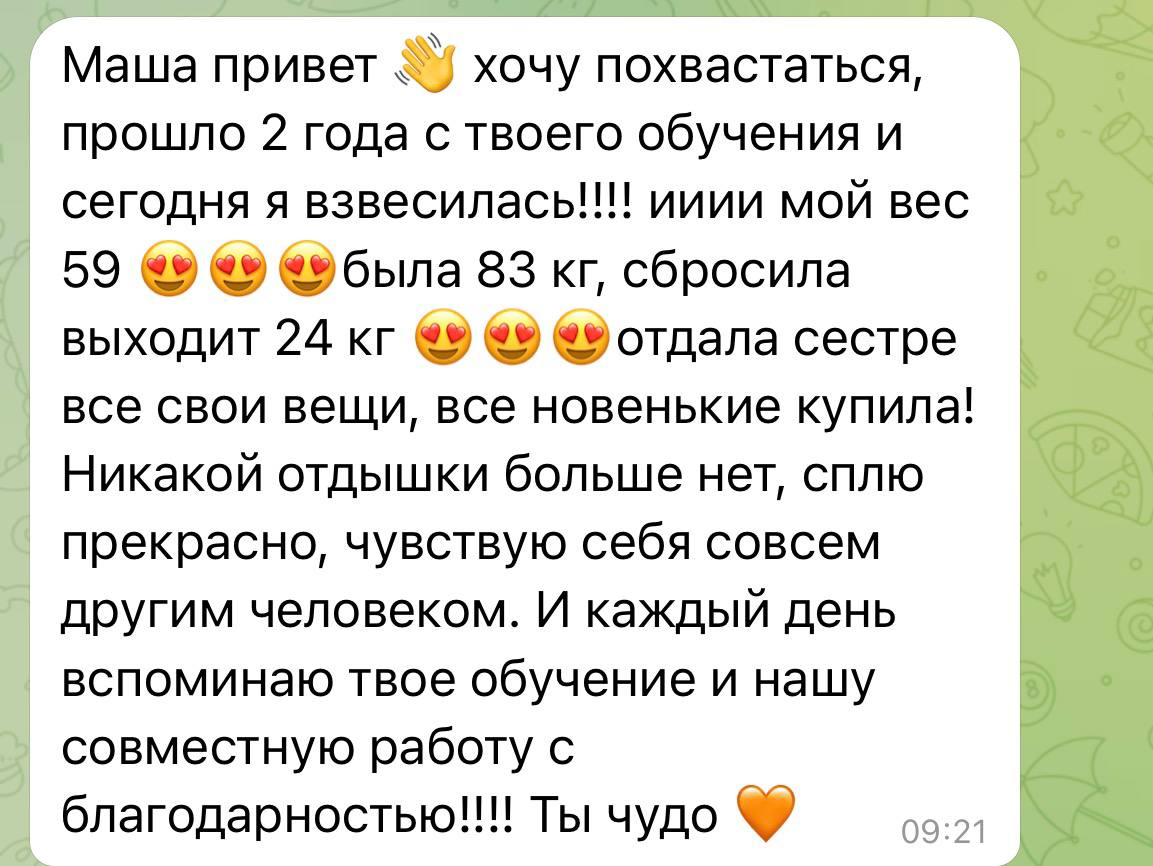 Я обещаю другое — что вы перестанете воевать с собой. А это, как показывает практика, дороже любой цифры на весах, полученной быстро.