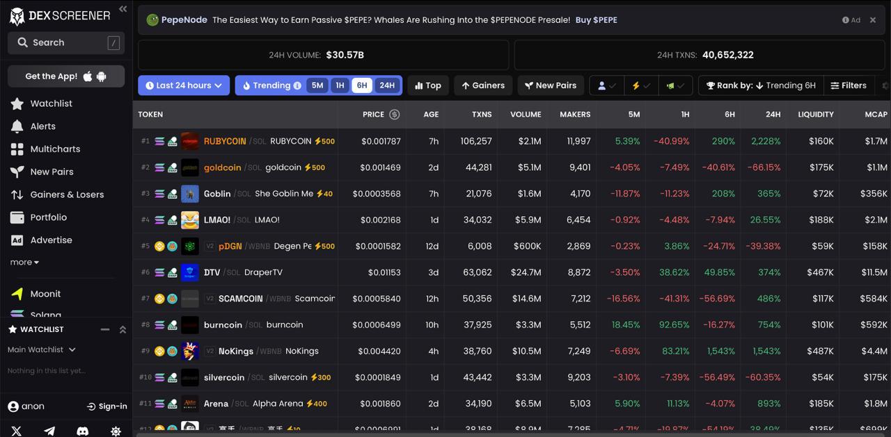 1️⃣ Монеты появляются в разных сетях: Solana, Ethereum, Base и других. Например,в сети Solana низкие комиссии и бешеная активность. Это идеальная среда для появления новых "ракет". Заходим в раздел "New Pairs".