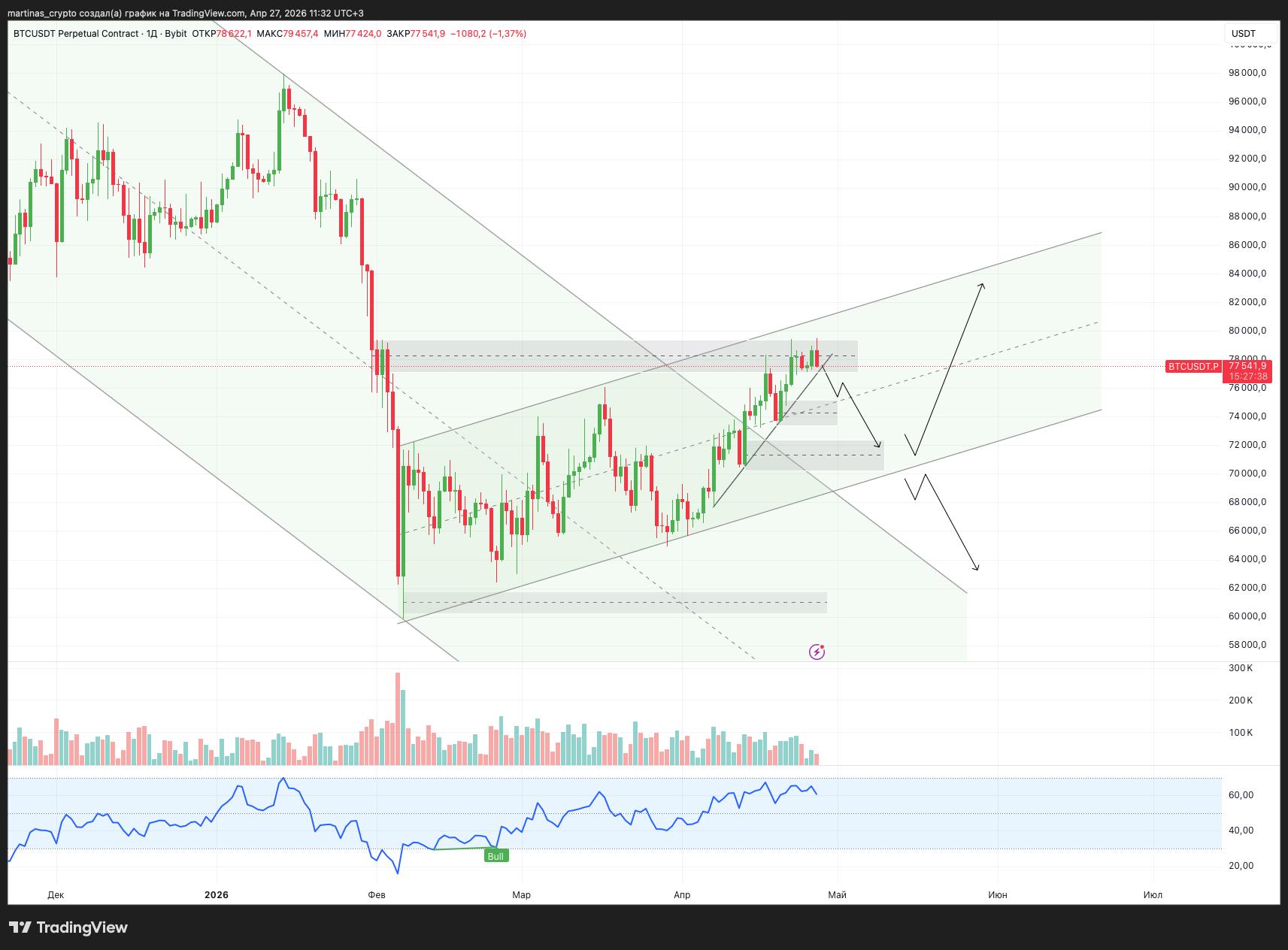 📉 Оптимальный сценарий: Возвращение к нижней границе восходящего канала. Это зона $72,000 - $73,000.