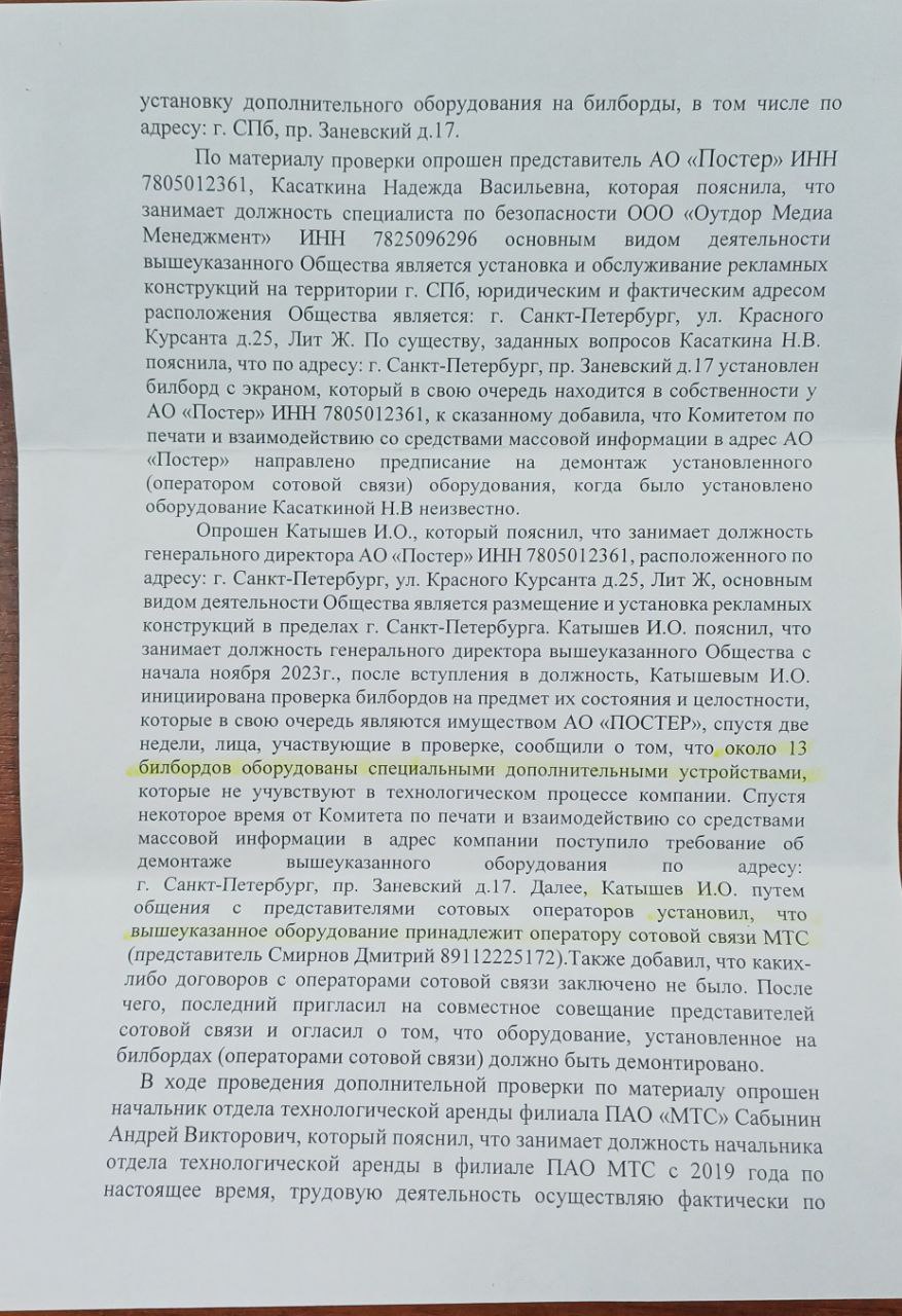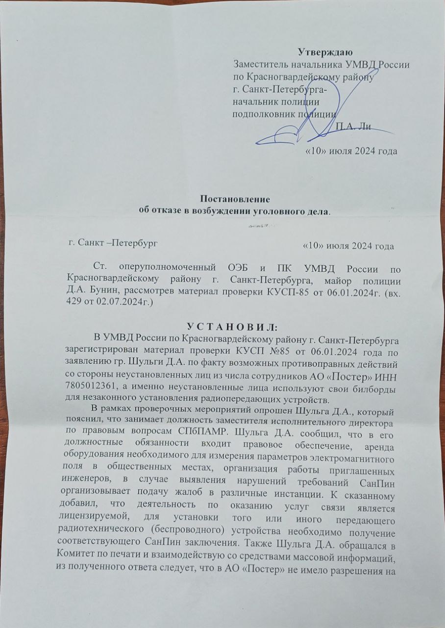 Сам текст постановления с описанием того, как должностные лица врут, что ни сном не духом про ПРТО на щитах, поджаривающее мозги прохожим - заслуживает отдельного разбора. Что характерно: в своём заявлении я требовал привлечь виновных сотрудников АО "Постер" и ПАО "МТС" по статье 236 УК РФ (нарушение санитарных норм и правил), но ментополицейские упорно отказывают в возбуждении уголовного дела по статье 159 УК "Мошенничество". Парадокс.