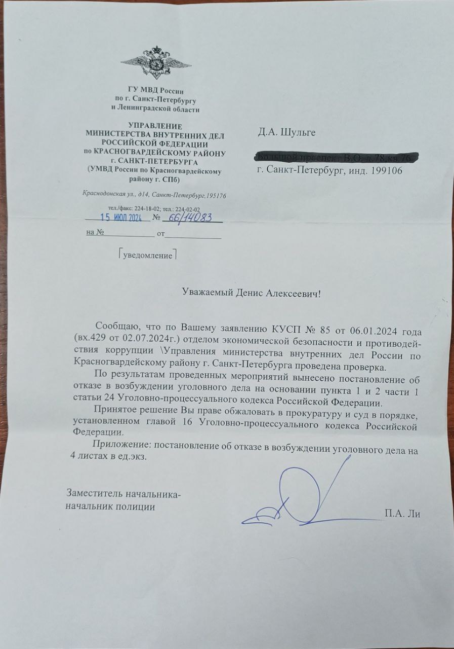 Спустя полтора года "нашлось" письмо с окончательным постановлением об отказе в возбуждении уголовного дела против должностных лиц компании - владельца "щита убийцы" и МТС.