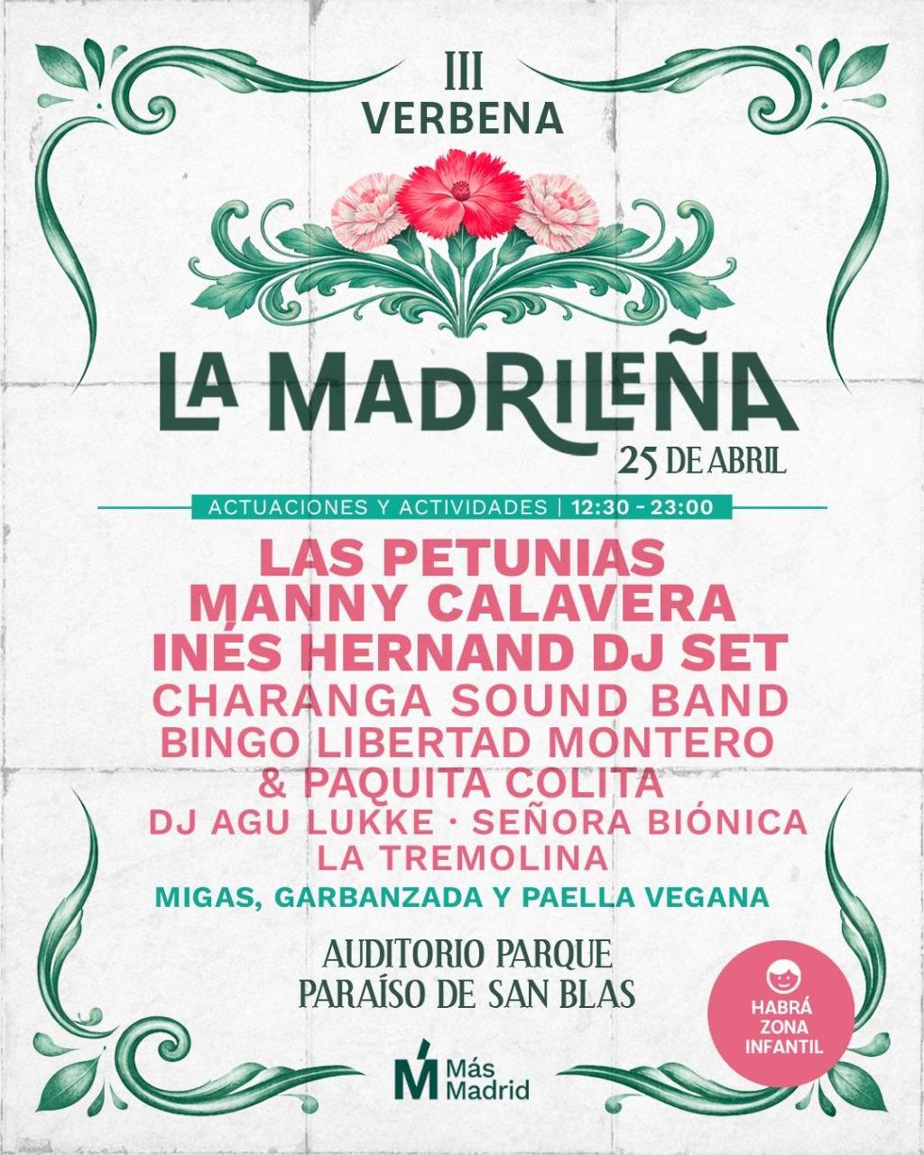 🎉 Vuelve 'La Madrileña', la verbena de Más Madrid, el 25 de abril en el Auditorio del Parque Paraíso de San Blas - Canillejas📍https://g.co/kgs/Mwrp6Lq