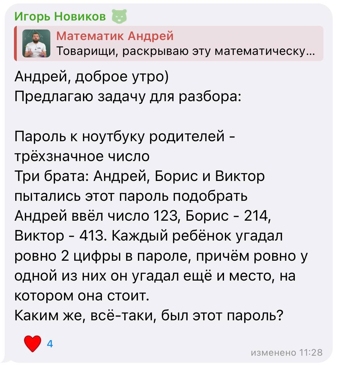 P.S. В комментариях я обнаружил и другой способ определить, что в пароле нет единицы. Выглядит он так: если предположить, что в пароле есть единица, тогда должна быть и какая-то пара чисел (кроме единицы): 23 / 24 / 34, но тогда получается, что в любом из этих случаев кто-то из ребят угадал все 3 цифры правильно, что противоречит условиям задачи. Возможно, для кого-то этот способ будет, короче, но не факт, что понятнее 😁